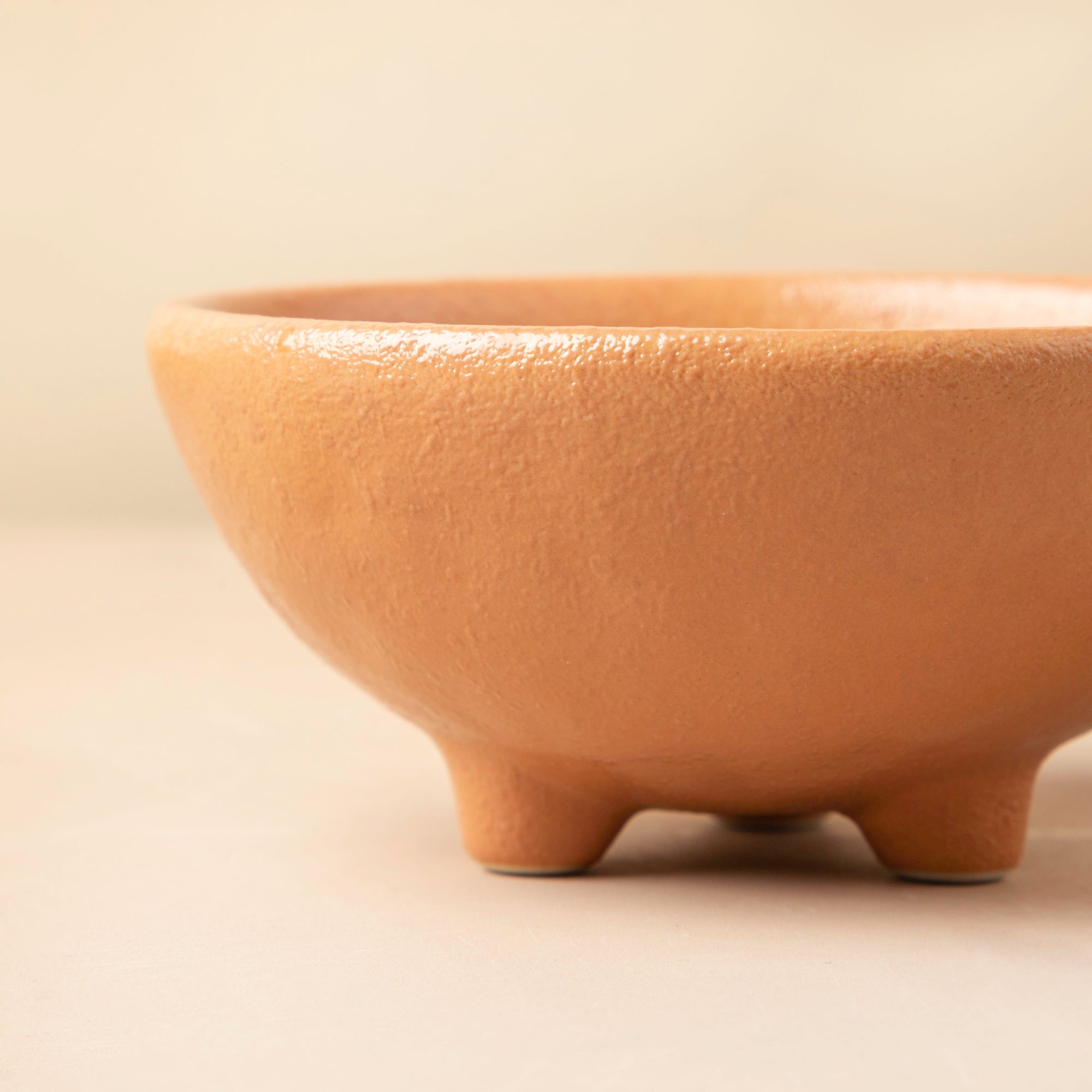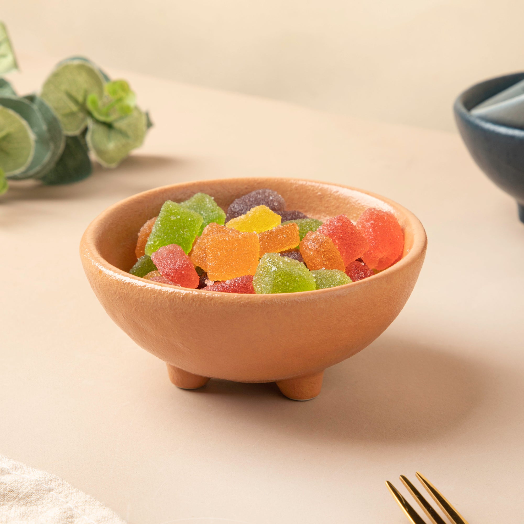 The small nuts bowl in a subtle peach shade is highlighted with textured dots which accentuate the aesthetic appeal of the ceramic bowl. Complement the peach dessert bowl with yellow and brown ceramic snack plates to complete the dining table set-up. One can use the peach ceramic bowl as a trinket bowl.
