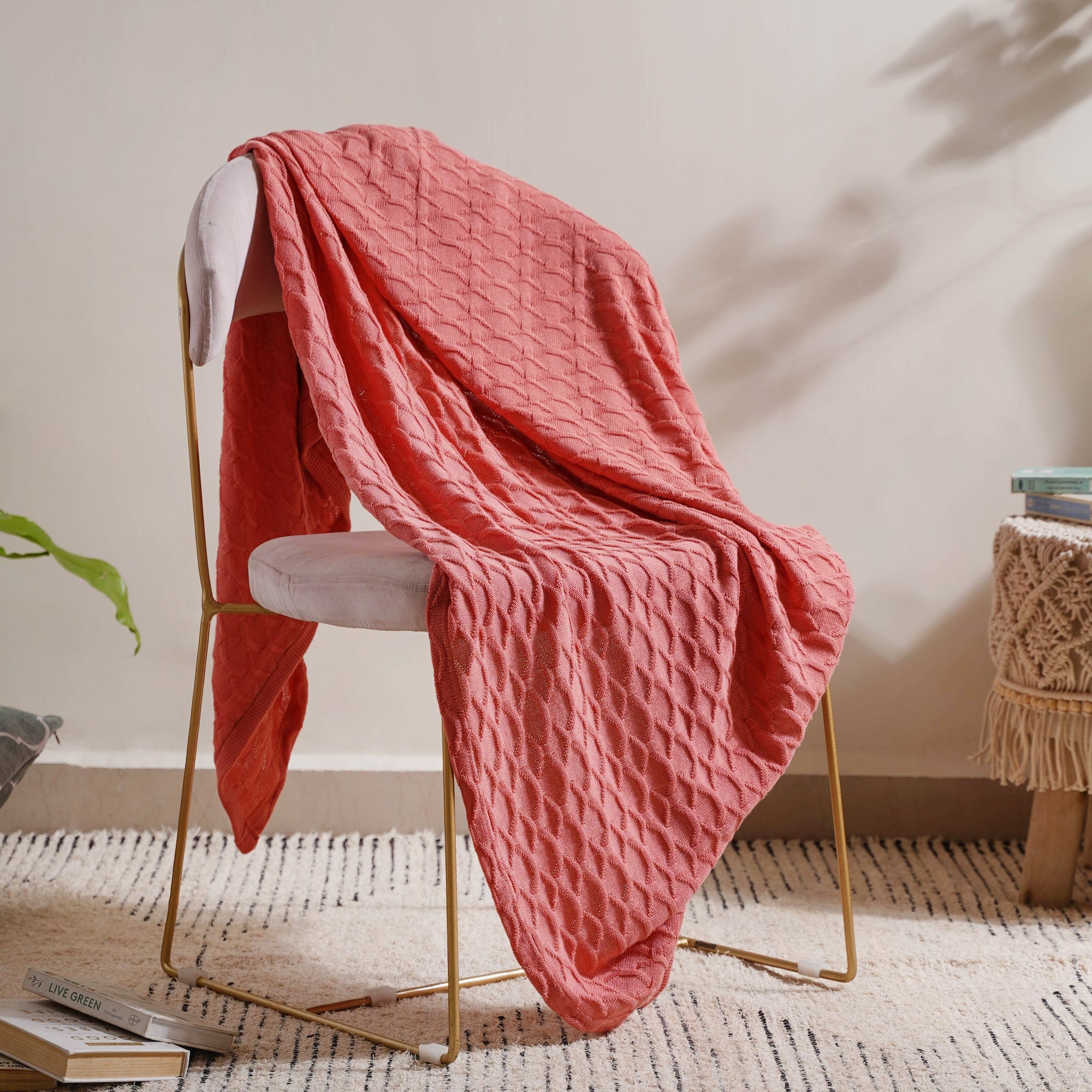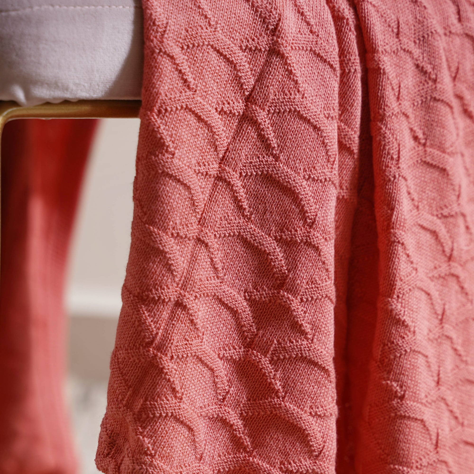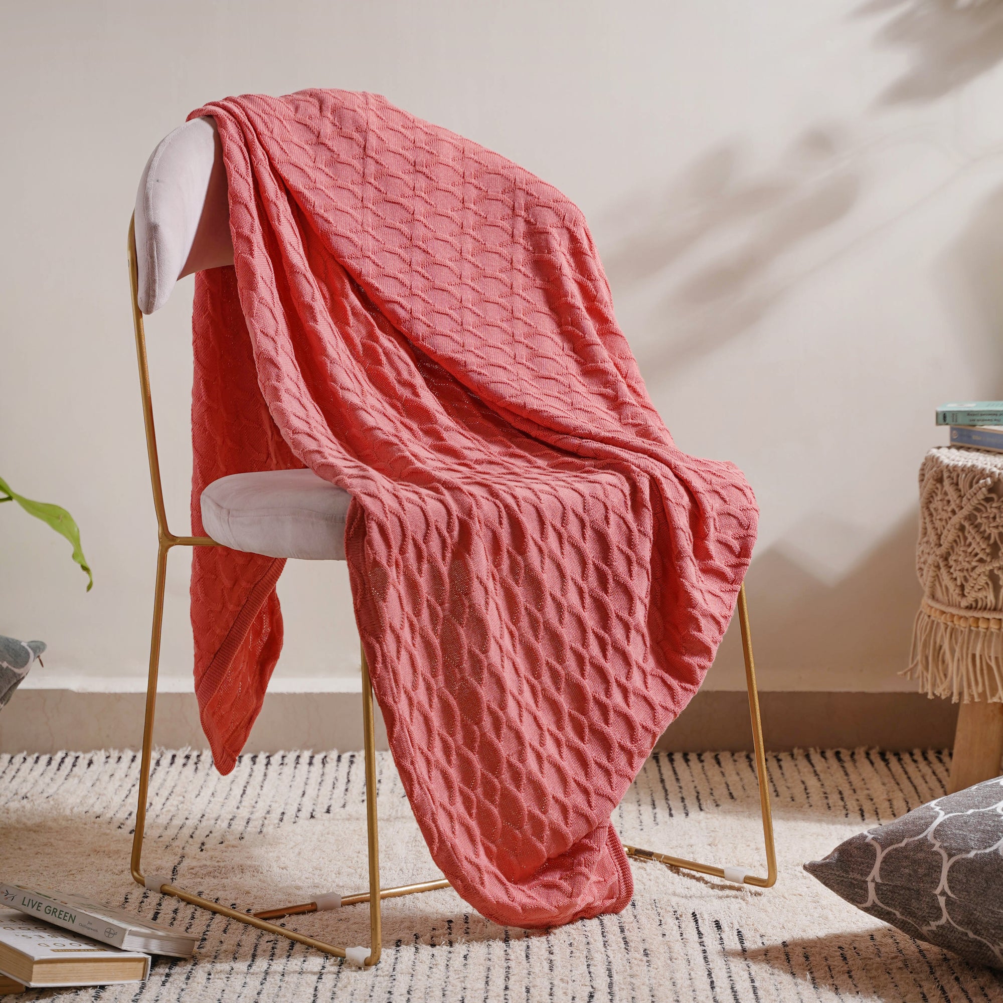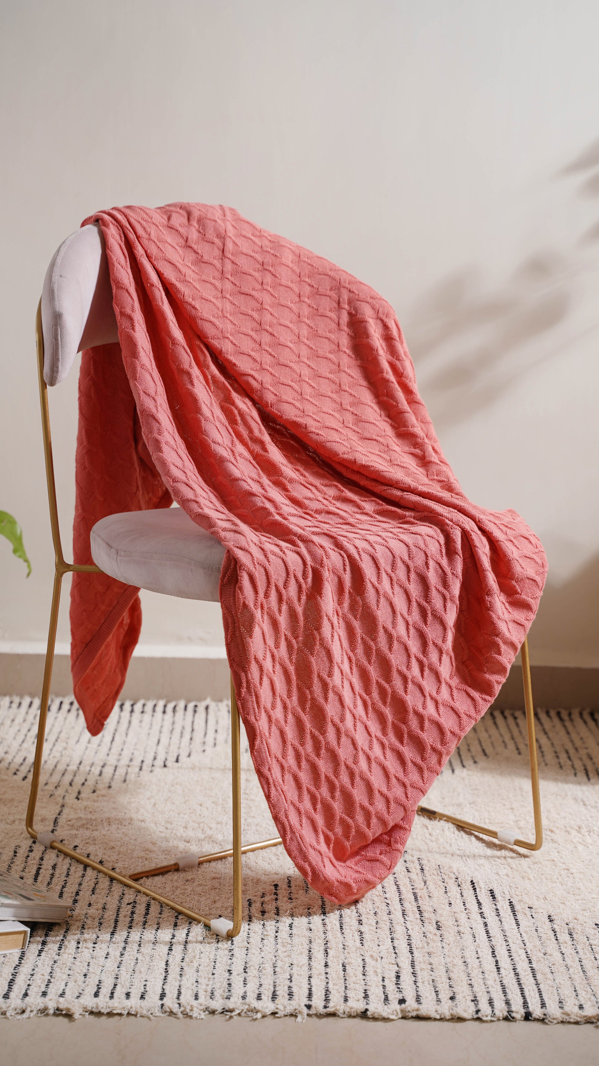 The soft knitted throw's subtle peach pink tone makes it a must-have for all home design fans. With this soft blush pink throw, you can add a pop of colour to a plain armchair, a sofa handle, or a bed post.