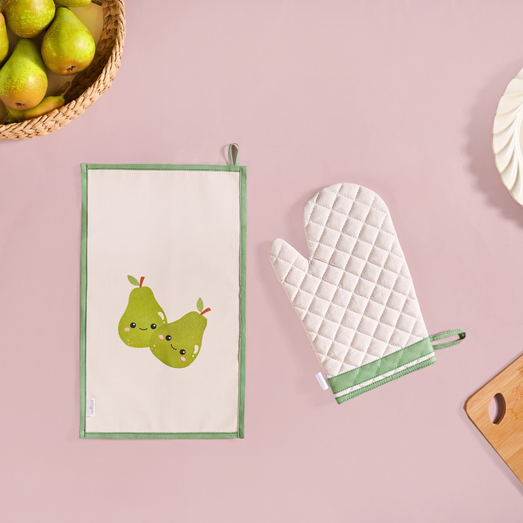 Design: This adorable off-white and lime-green set features the witty graphic "Tryin' to be Pearfect" and matching cute fruit images, instantly adding personality and warmth. The quilted mitten and coordinated hand towel blend seamlessly with the neutral canvas, creating a bright, charming statement in your kitchen.