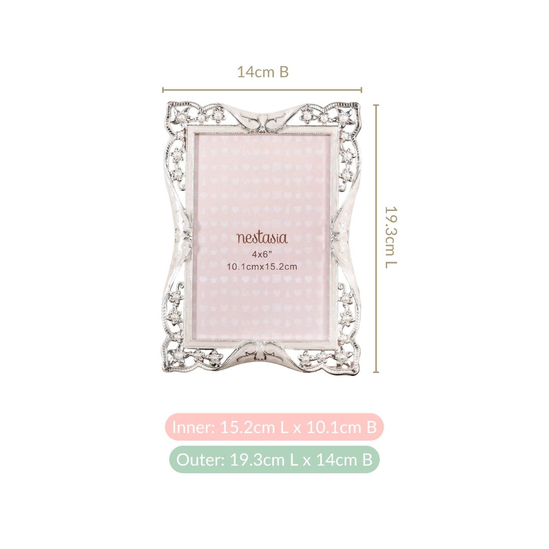 Display your most precious photos with vintage elegance. This stunning picture frame features a beautiful, lustrous silver detail. It is perfect for displaying 4x6" photos.