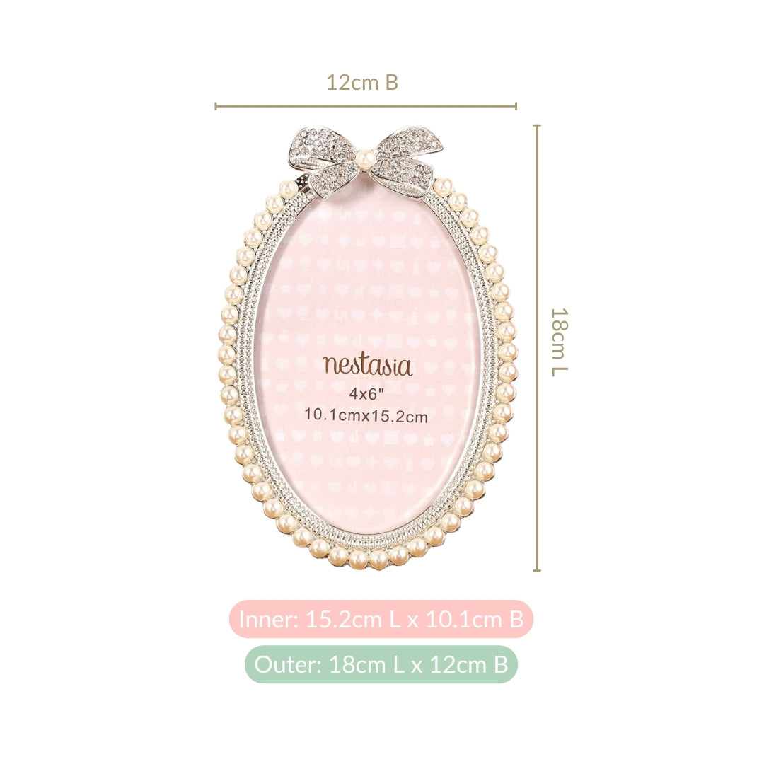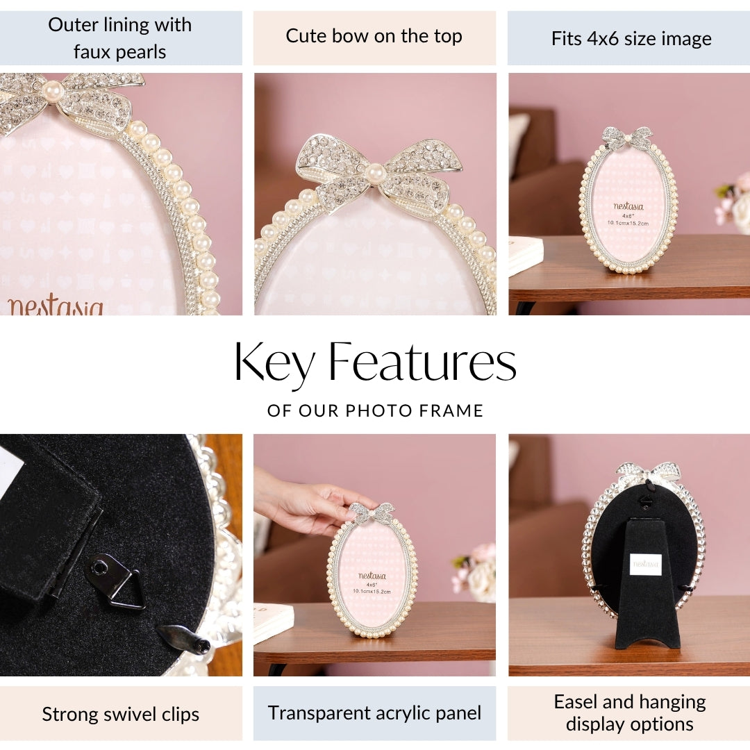 Design: Expertly crafted from durable resin, this elegant oval frame is bordered with radiant faux pearls that exude refined glamour. A stunning bow accent crowns the top, detailed with petite pearls and a central gemstone for a luxurious touch. The polished silver finish enhances its elegant aesthetic. The frame securely holds a 4x6 photo behind a transparent acrylic front for safe, long-lasting clarity. Designed for both tabletop and wall use, it comes with a sturdy easel back featuring a satin rope for support and a single hanging hook for flexible display options.