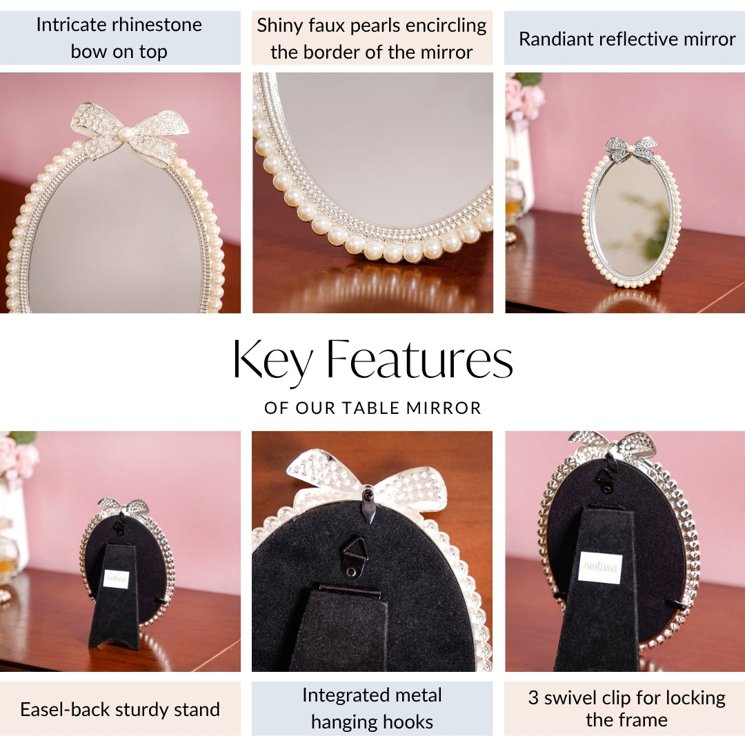 Design: Add a touch of vintage glam to your vanity with this oval pearl-studded mirror. Framed with glossy faux pearls and crowned with a sparkling rhinestone-studded resin bow, it’s elegance redefined. Perfect for makeup touch-ups, flat lays, or simply giving a princess touch to your decor, this mirror blends modern aesthetic with whimsy. A must-have for anyone who believes every reflection deserves a little sparkle!