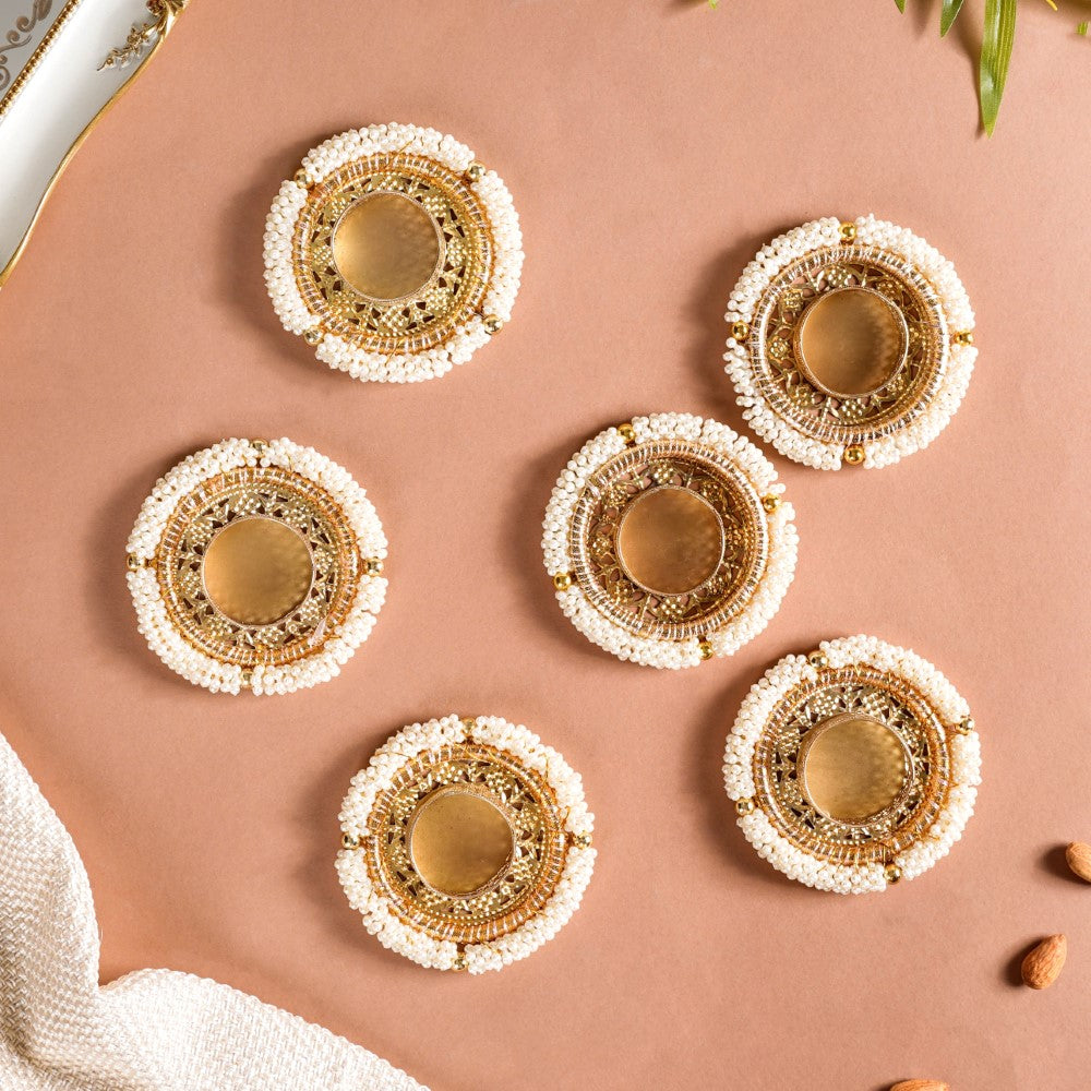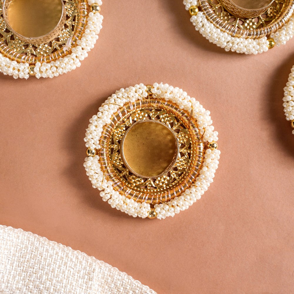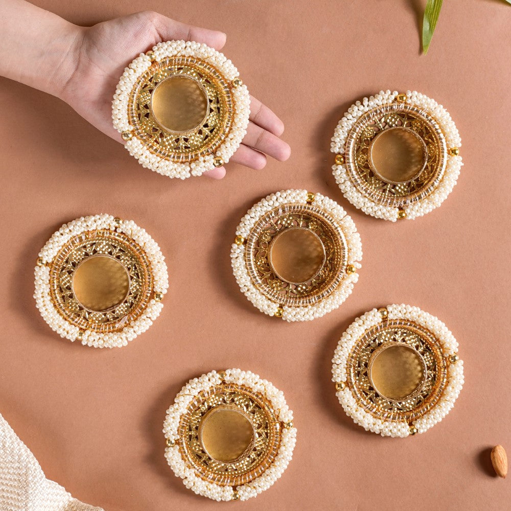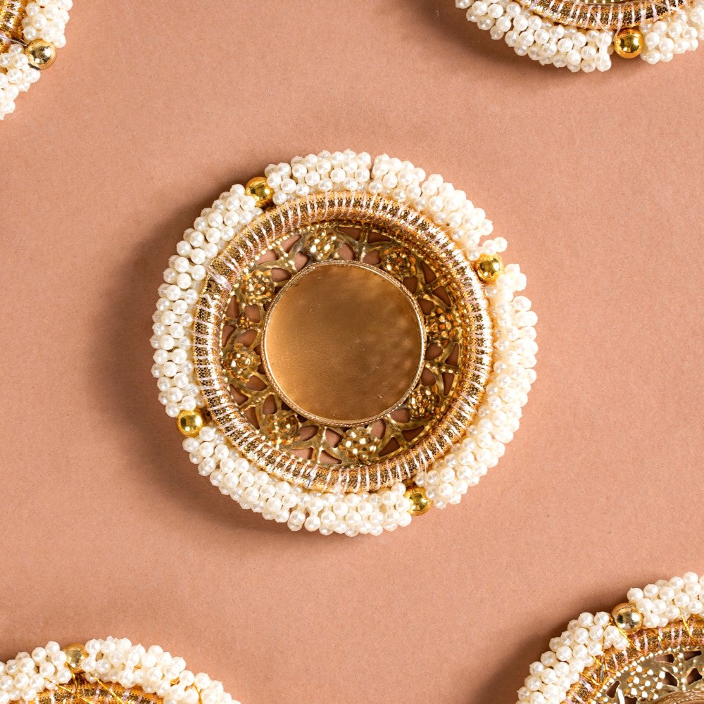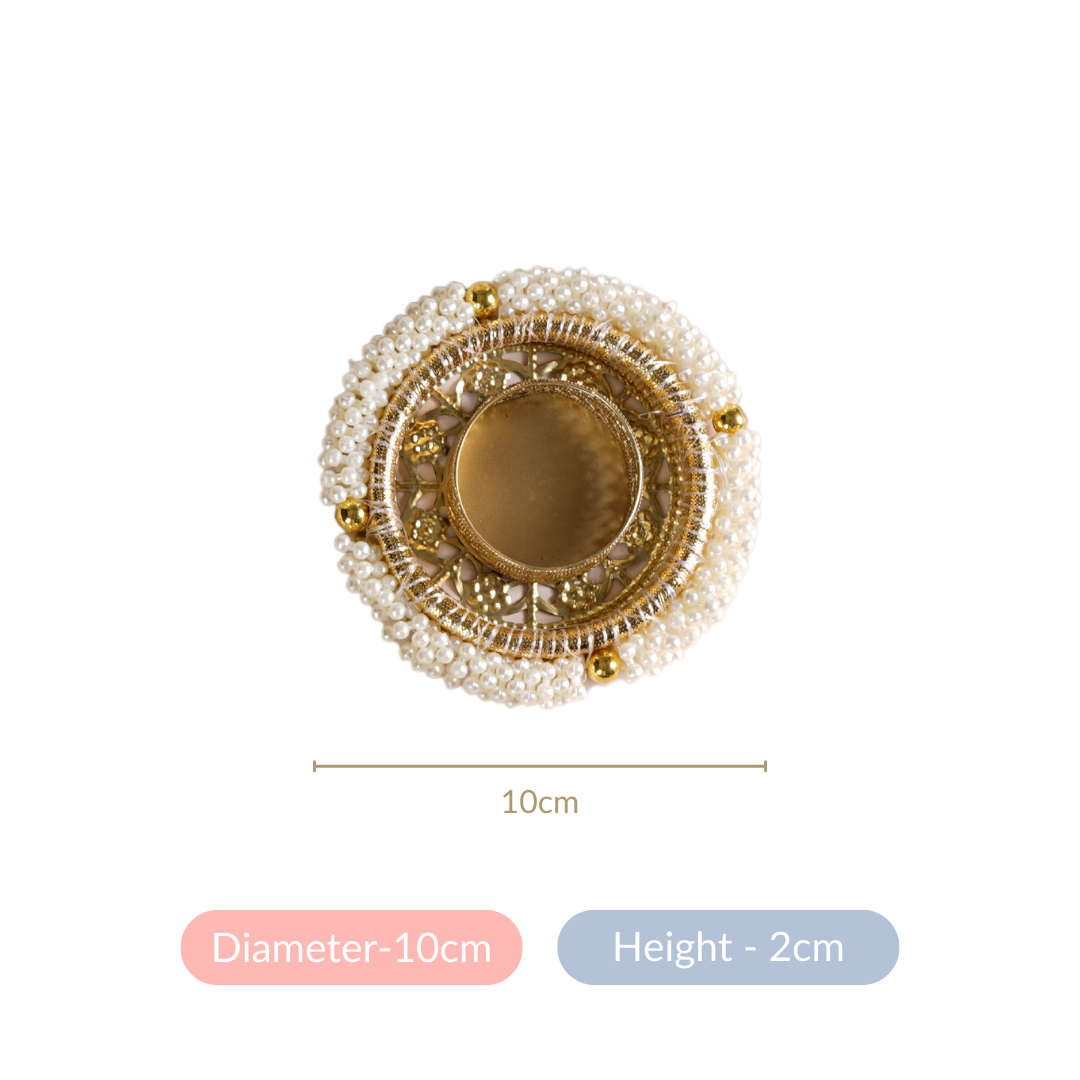 The artificial pearls and gotta patti work are the hallmark features of these tea light candle holders. Each holder is adorned with carefully selected artificial pearls that are skillfully arranged to create a stunning visual effect. Gotta patti work, a traditional Indian embroidery technique, is delicately applied around the pearls, enhancing the overall aesthetic. The combination of these elements results in a design that exudes opulence and beauty, making these candle holders truly stand out.