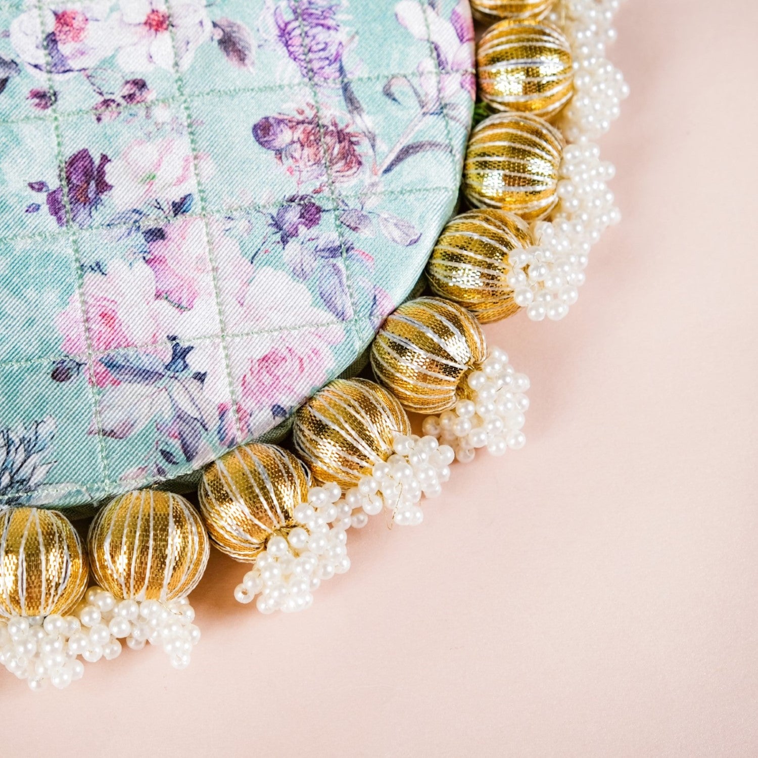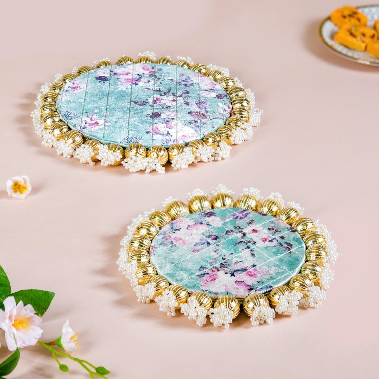 Set of 2 decorative mats of different sizes Premium quality polyester Cushioned quilted design Intricate beadwork Adorned with moti balls along the edge Gota Patti Zari work on the moti balls Sturdy MDF wood backing Handmade and artisanal Great for gifting Perfect for festive seasons Colourful floral design Digital floral print on polyester Wipe clean with a microfibre cloth