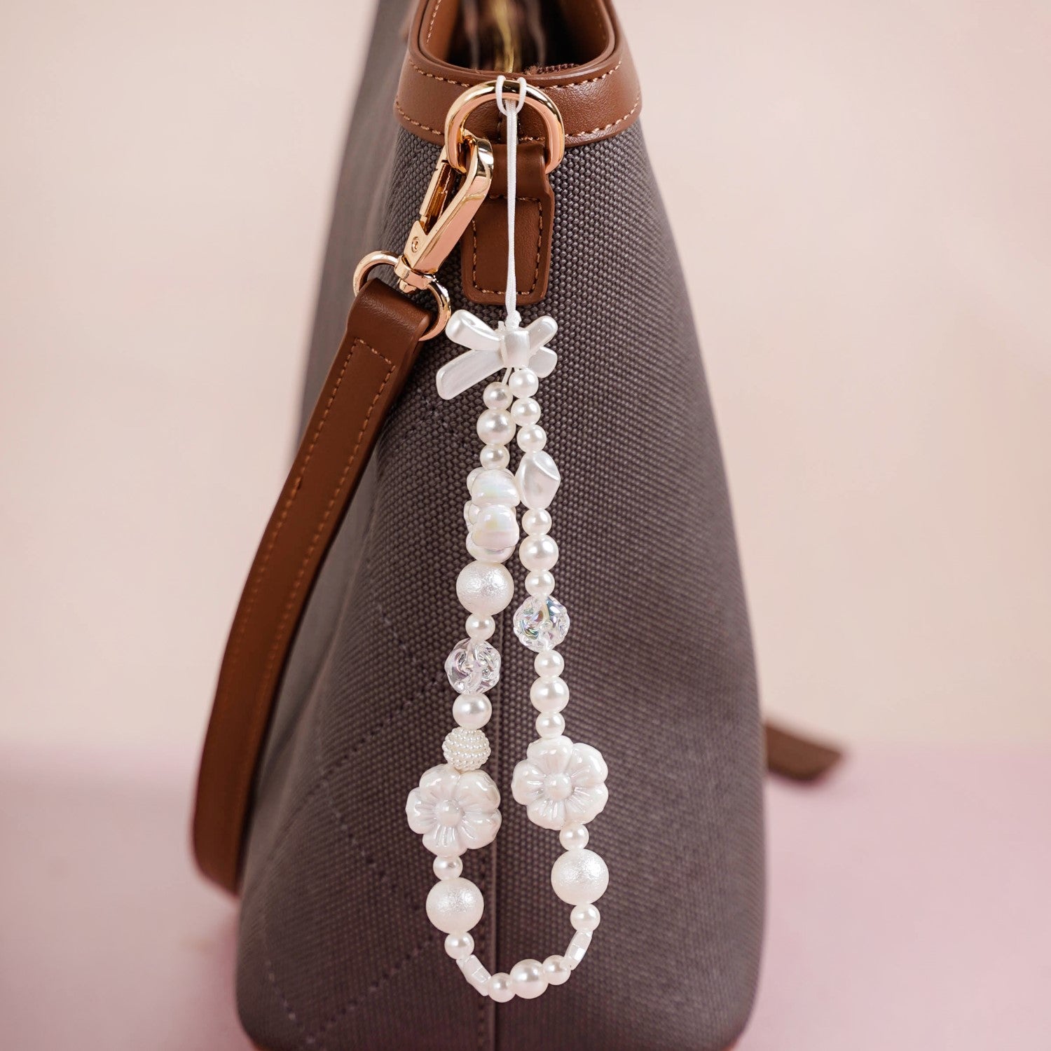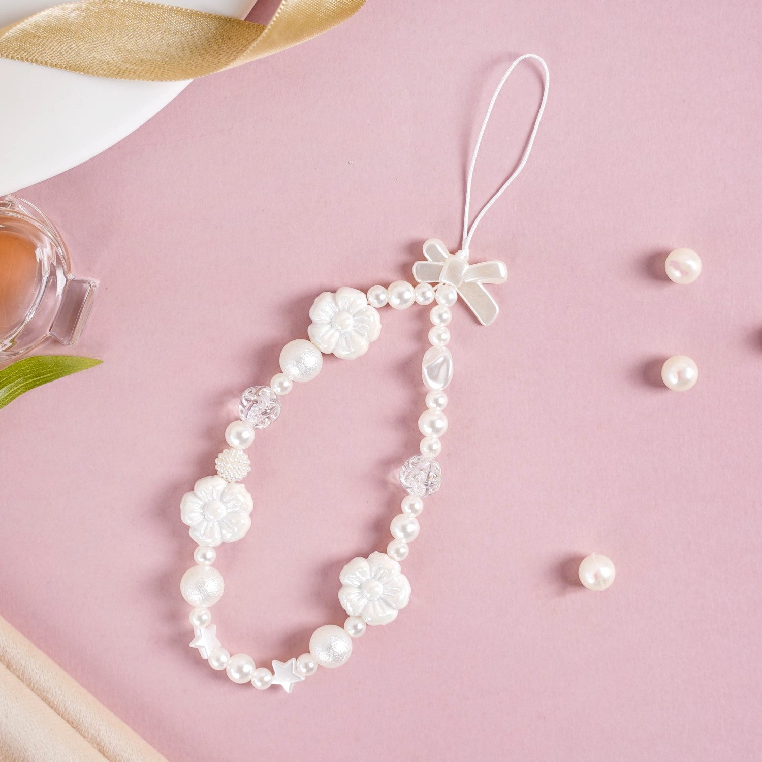 Who says phone accessories can't be fabulous? This gorgeous phone lanyard is here to add a pop of fun and flair to your device! With a stunning white pearl dangler, adorned with pearly white flowers and a bow that screams cuteness, it’s the perfect balance of sweet and chic.