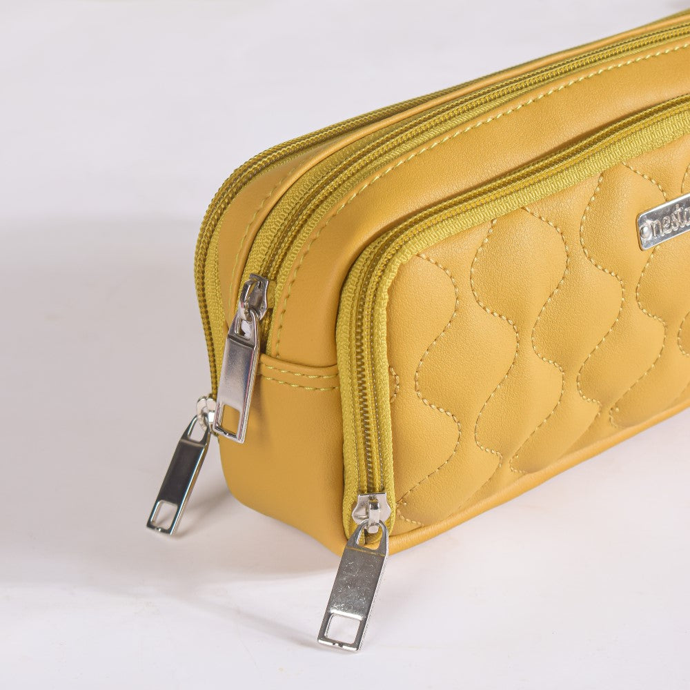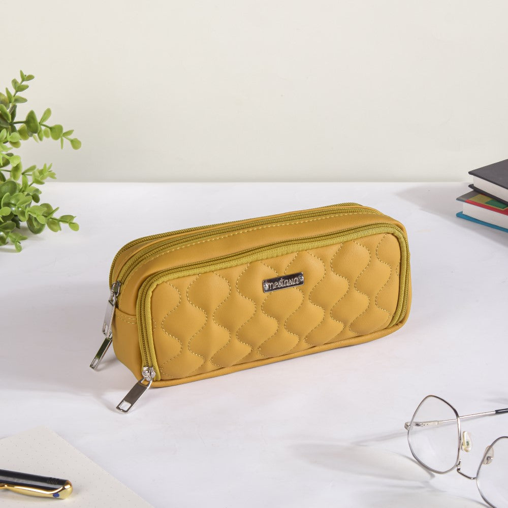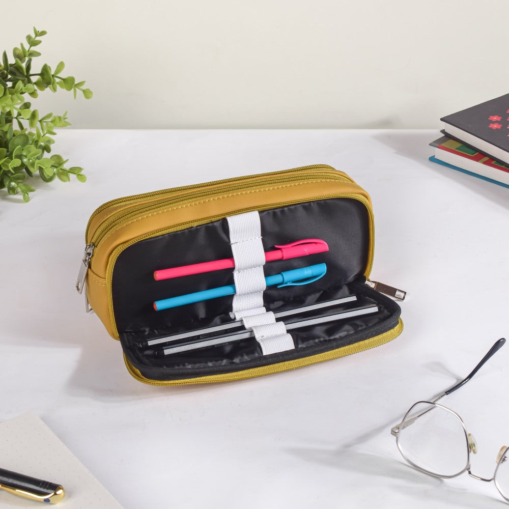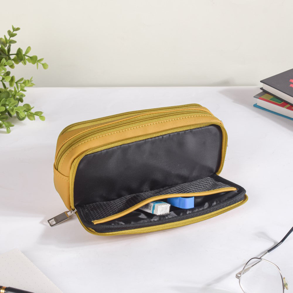 The yellow vegan leather pencil holder is composed of premium materials and has a stylish, long-lasting design. With its three roomy compartments, the eco-friendly pencil case makes it simple to organise stationery. The first compartment contains an elastic loop that will help you keep the pencils organised. The middle one is highlighted for it's spacious interior. The third compartment contains an inner mesh pocket to carry erasers, sharpeners, paper clips, or any other little but essential item. Outside of the mesh pocket, there is also a gap. The stationery holder bag is ideal for any workplace or classroom because of how portable it is owing to its small size. The bag includes sturdy stitching and a waterproof interior and exterior, so you can take it with you when you travel.