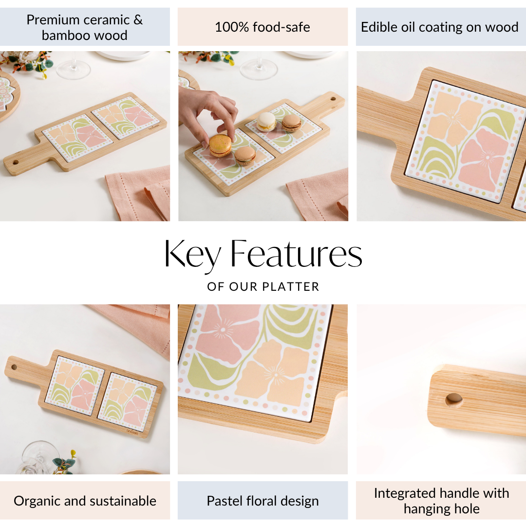 Design: This unique serving platter beautifully combines a natural bamboo wood frame with two premium ceramic tiles. The tiles feature a lovely pastel floral design with soft pink, pale yellow, and soft green colours, surrounded by a delicate dotted border. The sturdy bamboo serving platter board includes an integrated handle with a hanging hole, making it easy to carry and simple to store. The clean lines and cheerful pattern make this piece a standout addition to any collection.