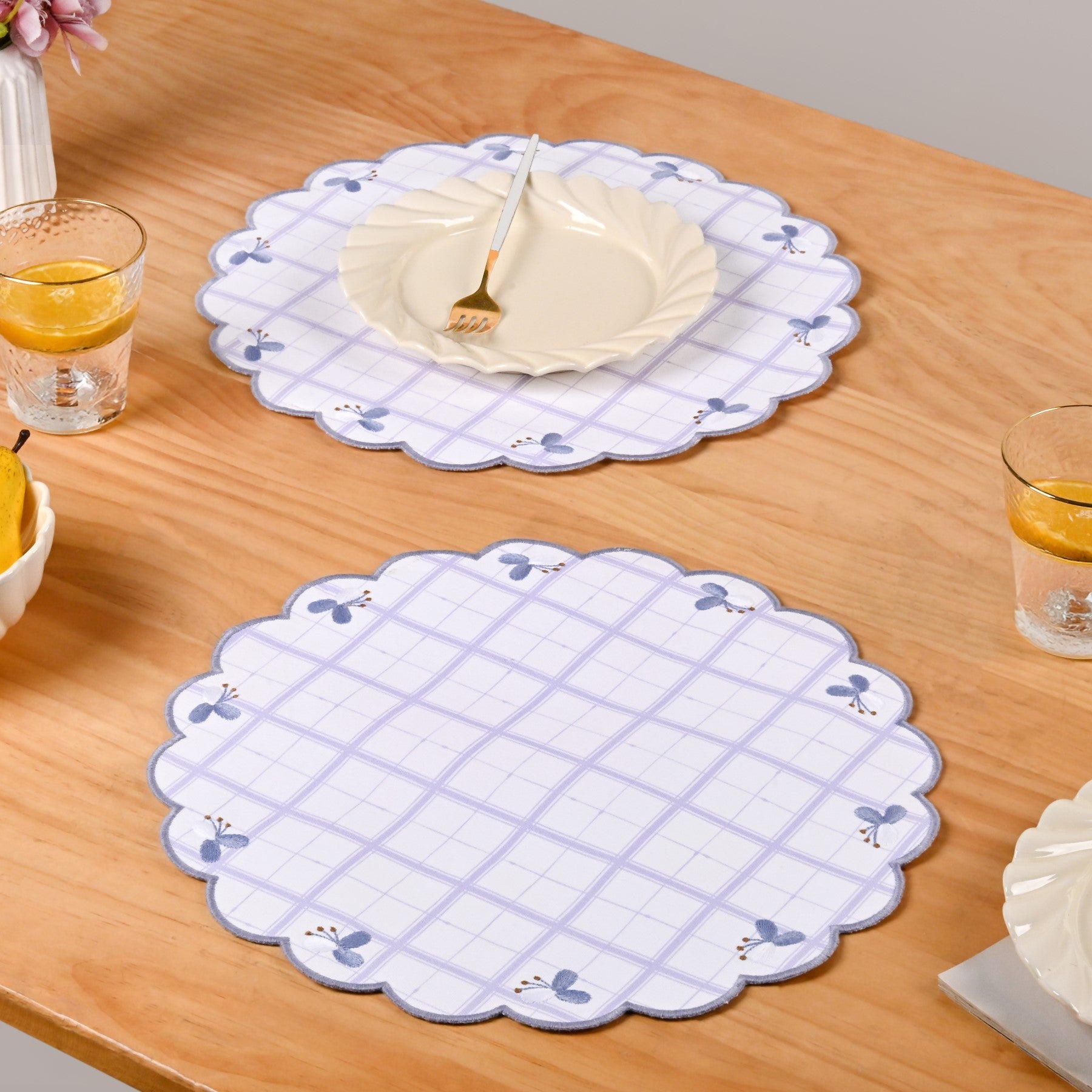 Design: Made from 100% pure cotton, this table mat set features a white base with a soft lilac checkered pattern. Delicate purple and white embroidery is thoughtfully adjacent to the scalloped edges with lavender piping, giving it a decorative finish.