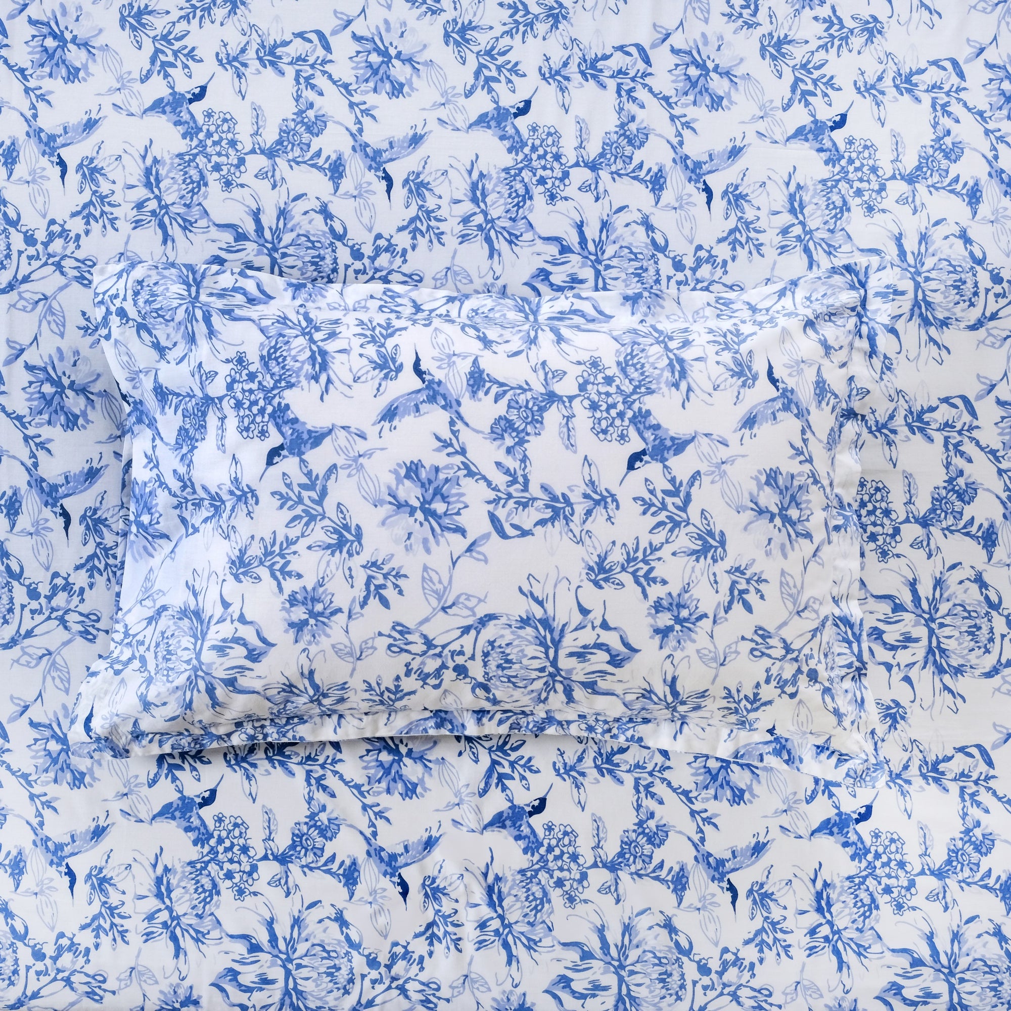 Design: Adorn your bed with the beauty of a blue floral and hummingbird print. The intricate, patterned design, featuring varying shades of blue, brings a classic and serene aesthetic to your bedroom. This set includes one king-size bedsheet and two matching pillowcases for a cohesive look.