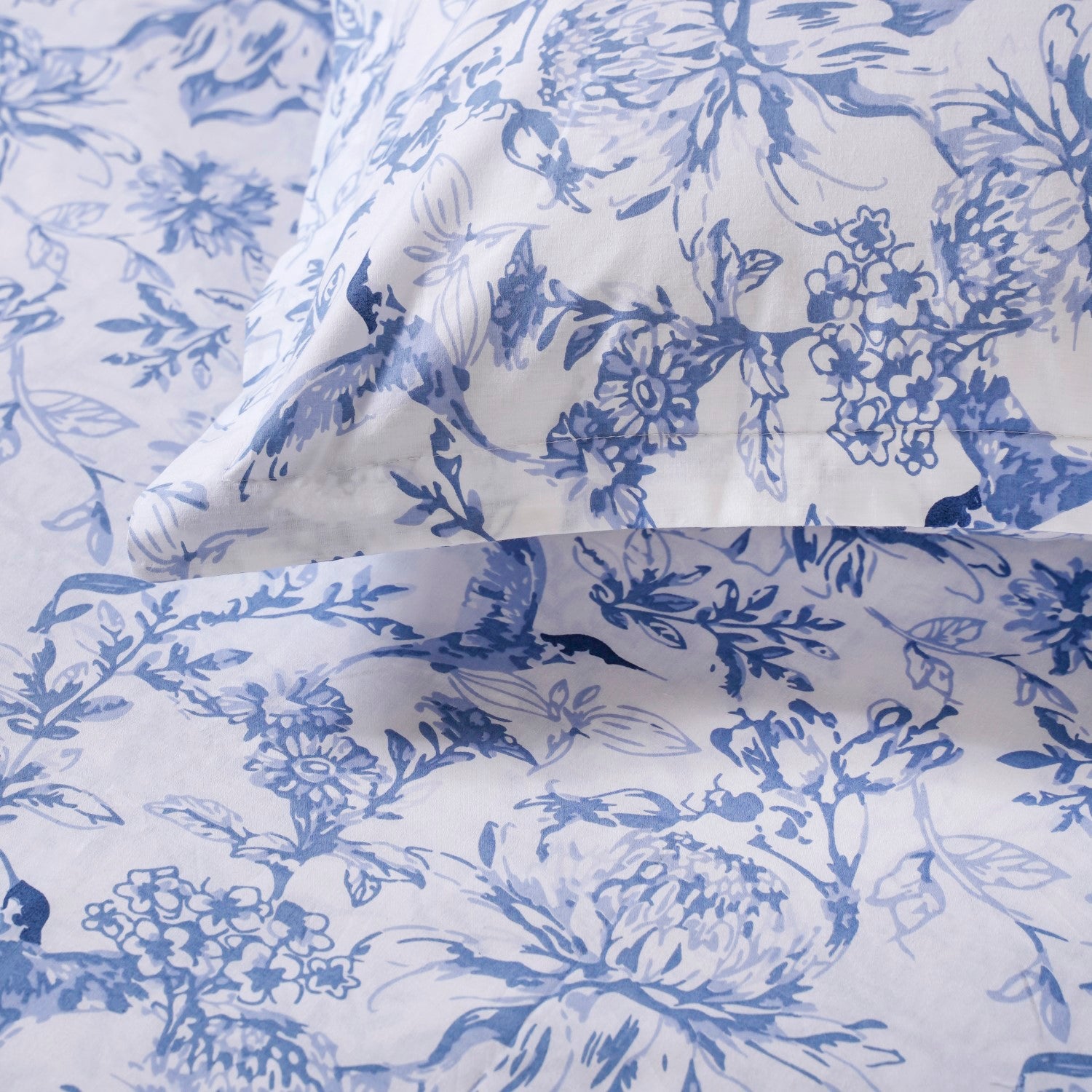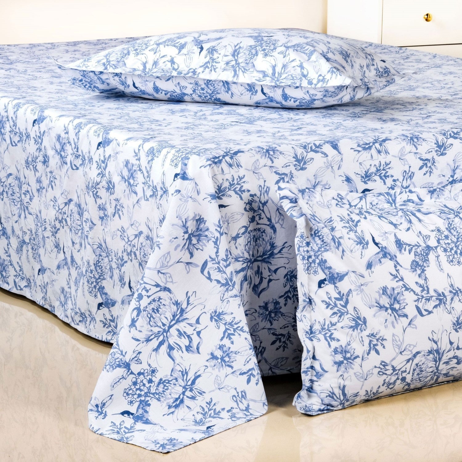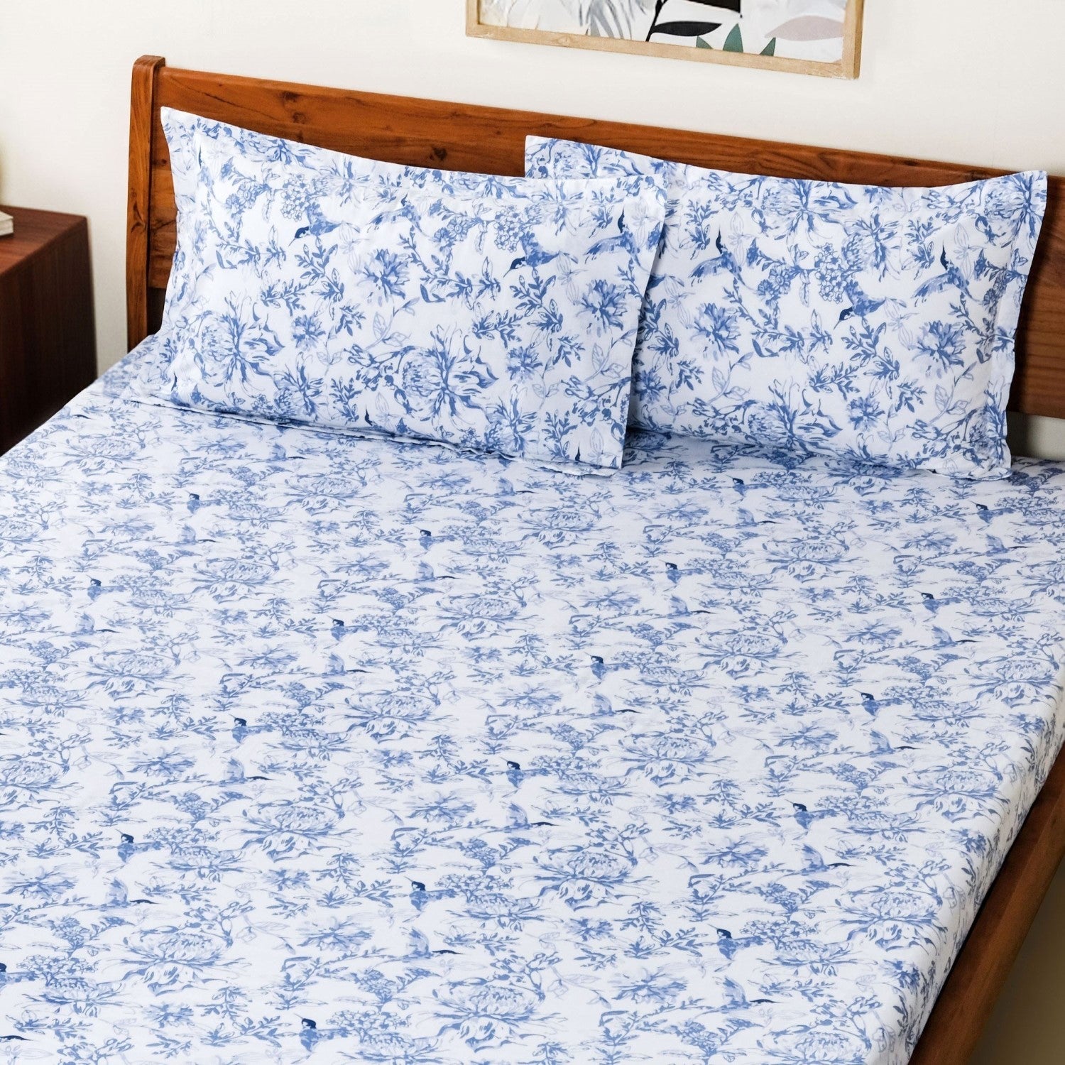 Design: The intricate pure cotton bed linen set features blue floral and hummingbird print. The varying shades of blue against a white, crisp background bring a classic and serene aesthetic to your bedroom. The queen-size bedsheet comes with two matching pillowcases.