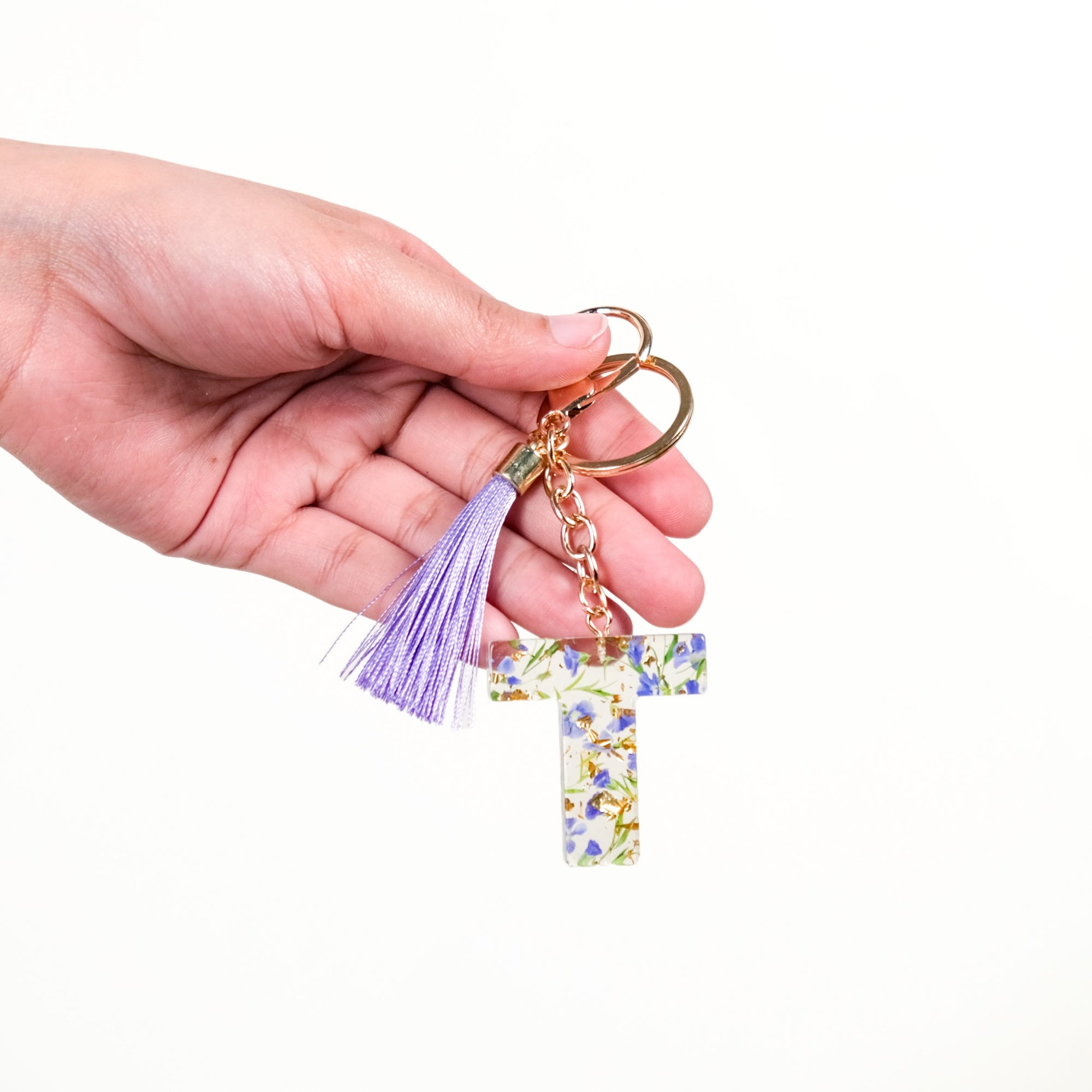 Add sophistication to your accessories with the "T" resin keyring. Featuring a transparent resin construction, the keychain showcases pressed lavender forget-me-not flowers (Myosotis), also known as scorpion grass, symbolising love and cherished moments. A dash of golden flecks adds sparkle, while a sleek satin tassel enhances both style and utility.