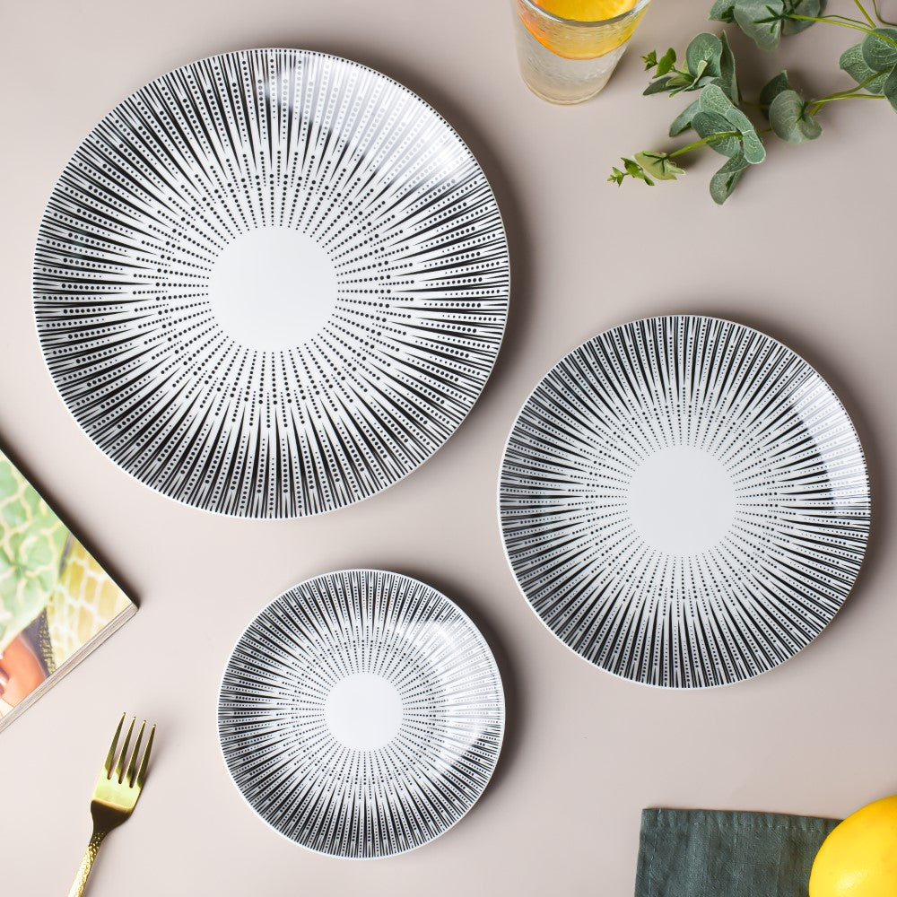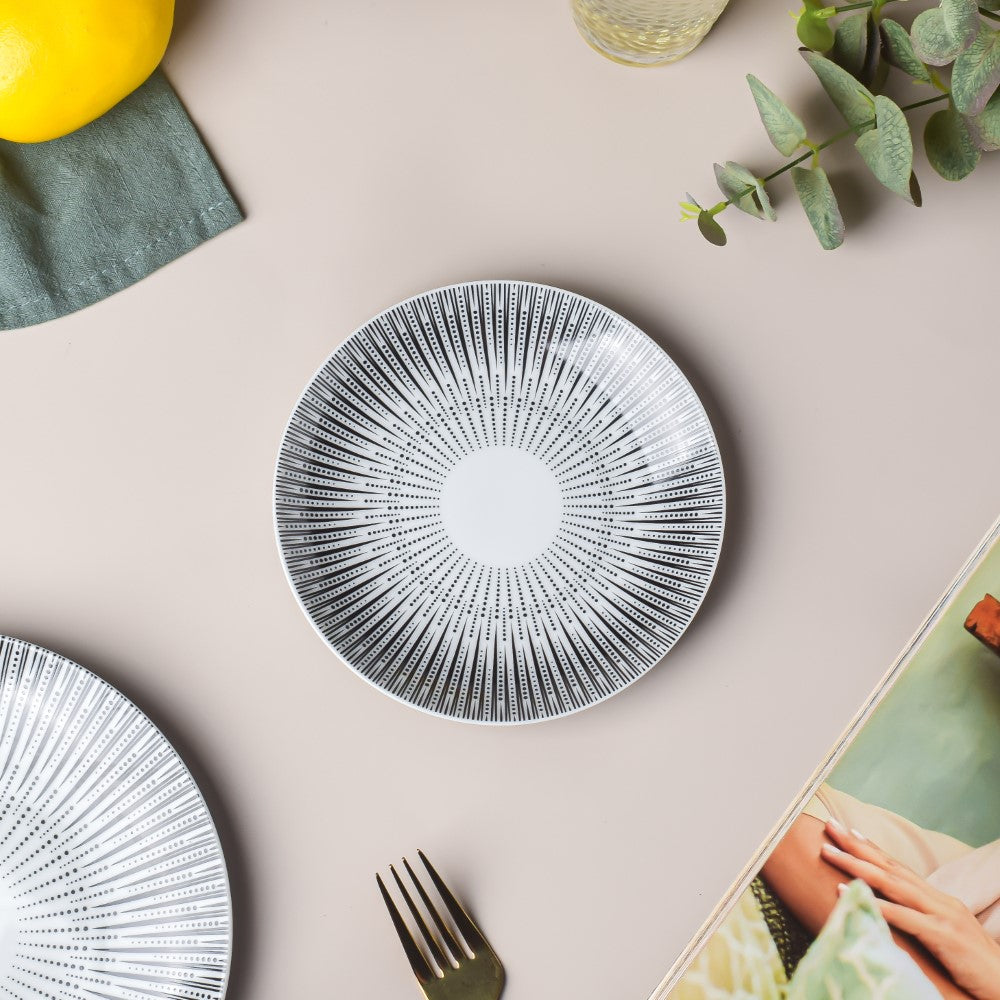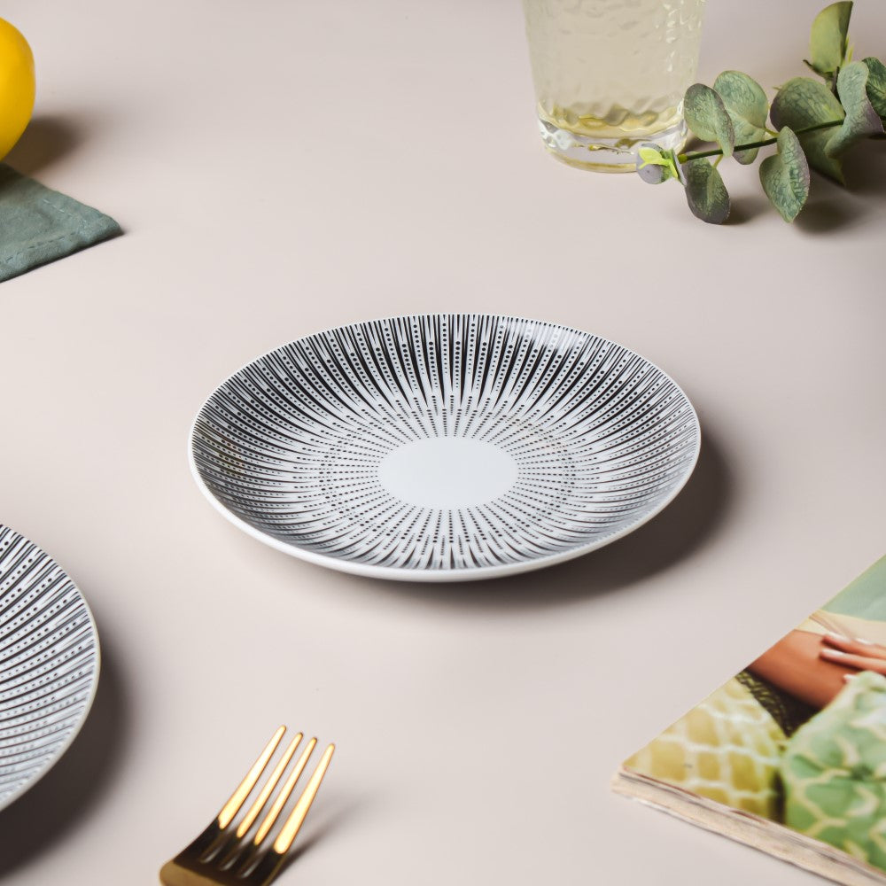 The ceramic plate holds desserts and small portions of appetisers charmingly. The small ceramic plate is ideal to serve ice cream and pastries during intimate meals or during social gatherings. The white and black ceramic plate features a smooth surface and linear black patterns that give the ceramicware a unique artistic touch.