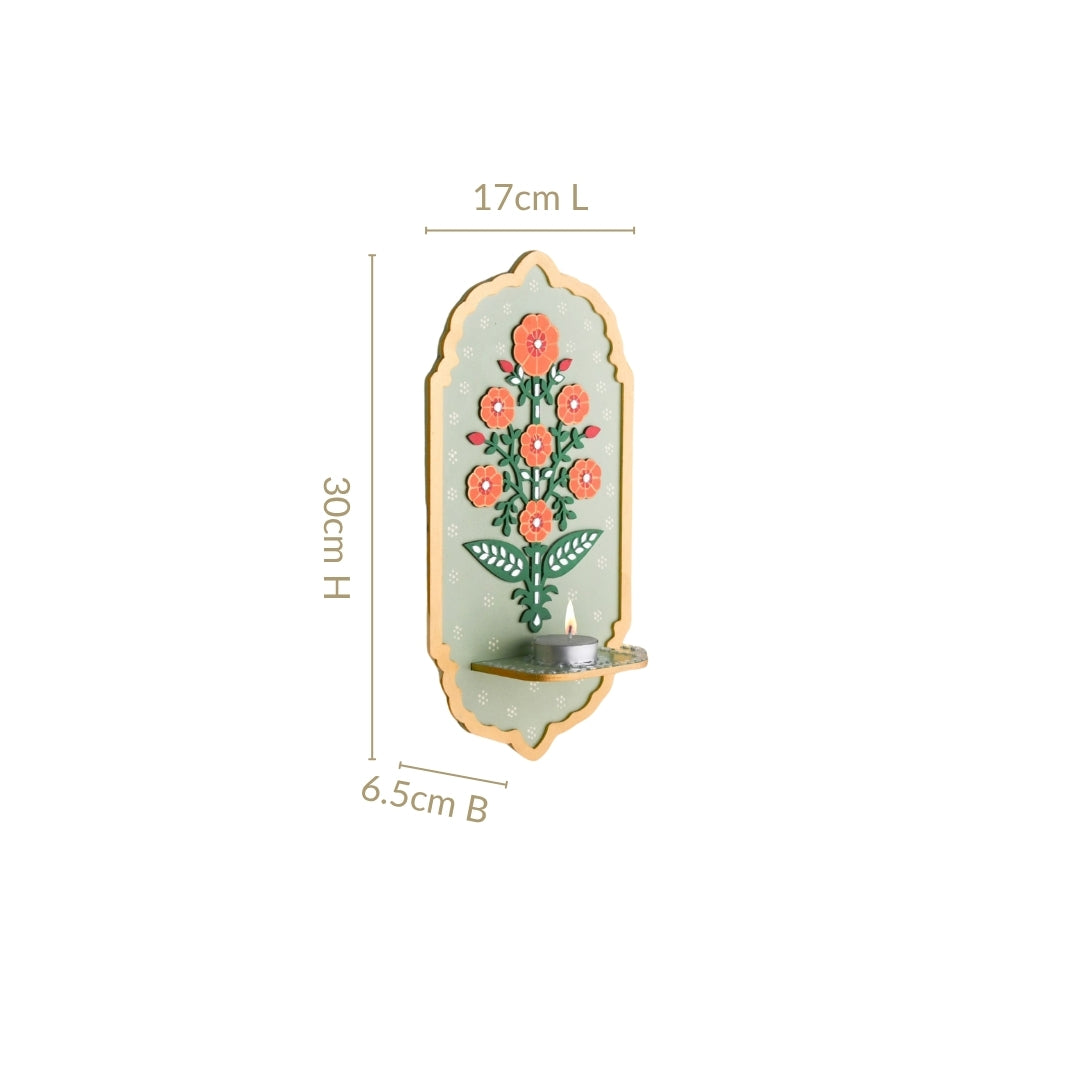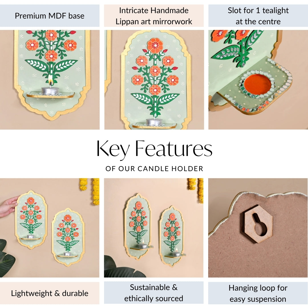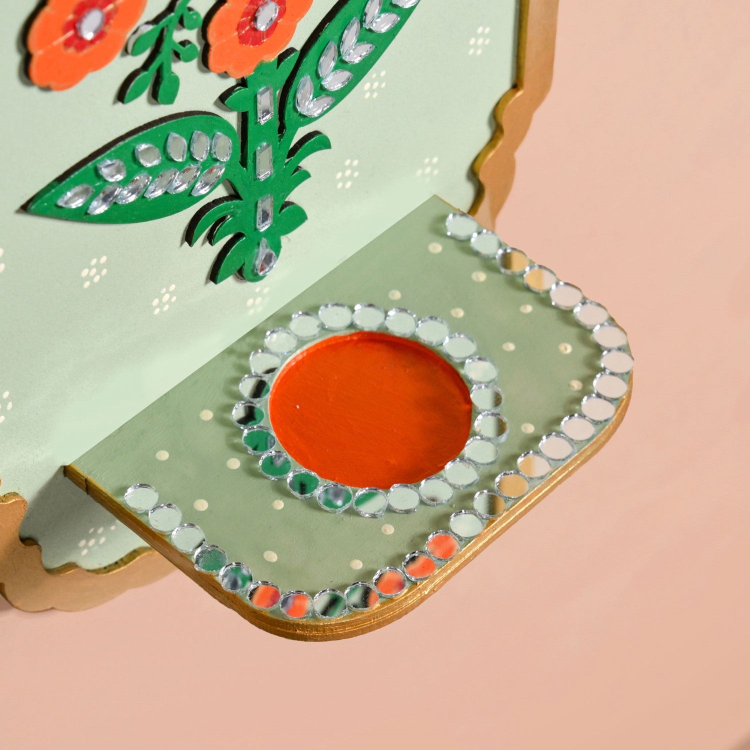 Design: With a blend of traditional craftsmanship and modern appeal, each piece serves as a celebration of intricate detail and vibrant colour. Ideal for festive décor, gifting, or everyday use, this holder adds warmth and elegance to any room. The central orange slot is designed to hold a tealight, reflecting gentle light off the delicate mirrorwork and floral motifs for a soothing, celebratory ambience. The design features a blooming tree of life in shades of bright orange, red and green, set against a soft pastel mint green backdrop. Hand-painted flowers, outlined with mirror details and white accents, add depth and sparkle. A golden arched border frames the piece, infusing it with a regal charm.