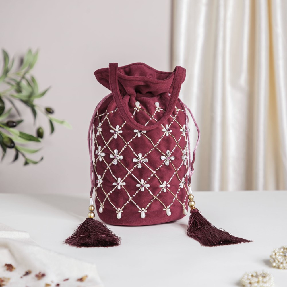 Nestip: This maroon potli bag can be used by brides as a matching accessory with their outfits.