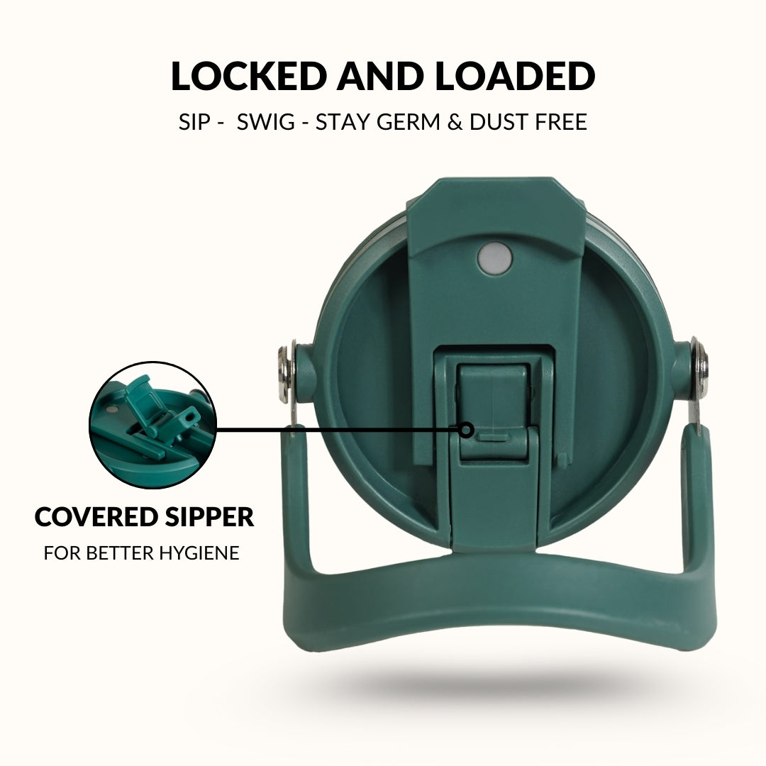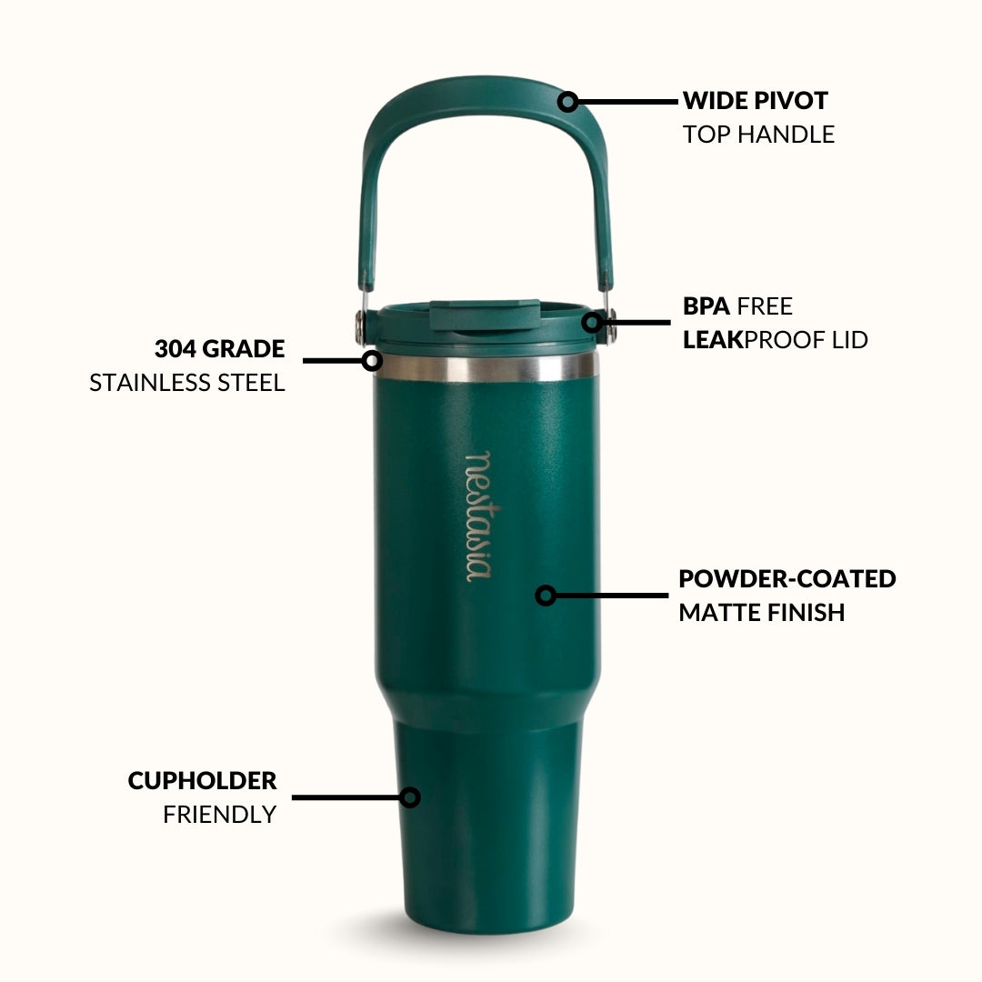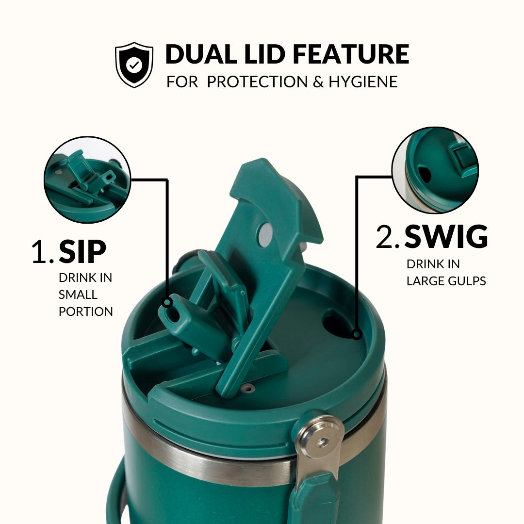 Design: Crafted from high-quality stainless steel, this 1200 ml insulated tumbler features a tri-ply insulated body with a smooth, cylindrical silhouette. It is fitted with a leak-resistant secure dual sip and swig lid, along with an integrated top handle for easy carrying. The exterior is finished in a rich Emerald Isle green tone, offering a fresh yet minimal look suited to everyday use.
