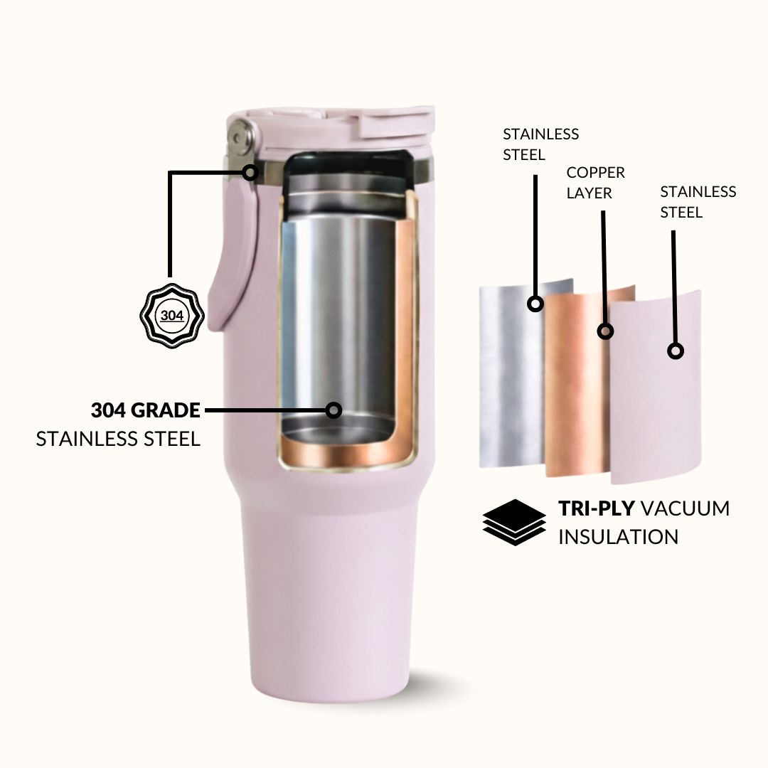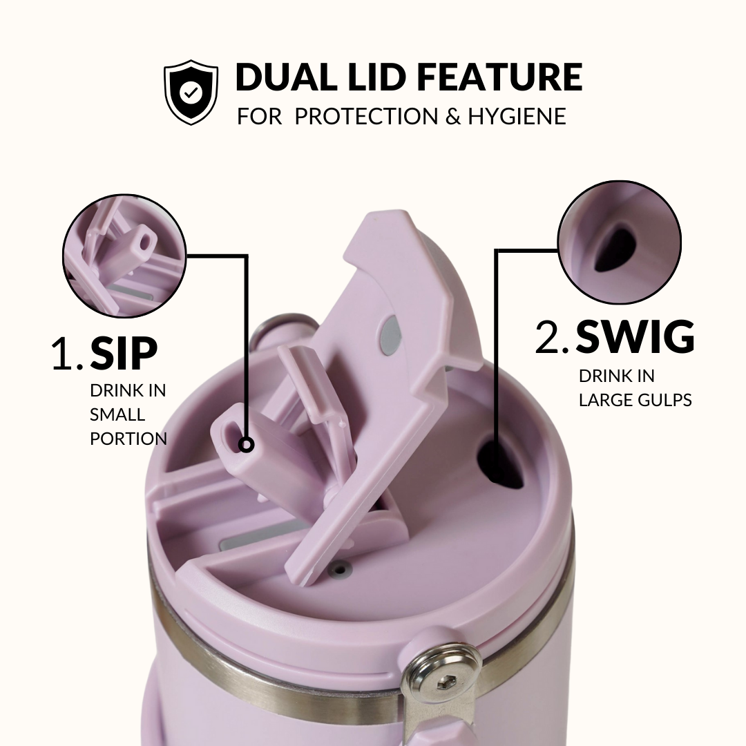Design: Made from high-quality stainless steel, this 1200ml tumbler features a sturdy tri-ply insulated body and a sleek cylindrical shape that sits comfortably in your hand. It comes with a secure, leak-resistant dual sip and swig lid, along with a built-in top handle for convenient carrying. The smooth lilac finish gives it a refined, contemporary appeal suited to daily use.