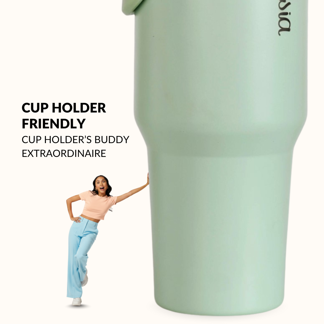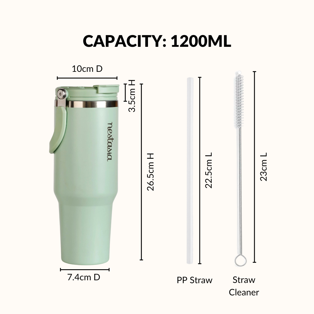 Design: Designed in a tall, sleek cylindrical shape, this 1200ml tumbler has a smooth, seamless finish and a refined look. Made from premium stainless steel, its tri-ply insulated body provides a sturdy, layered build. The lid features dual sip and swig openings with a secure, leak-resistant seal and a sturdy top handle for convenient carrying. The muted pastel green shade brings a calm, contemporary feel.