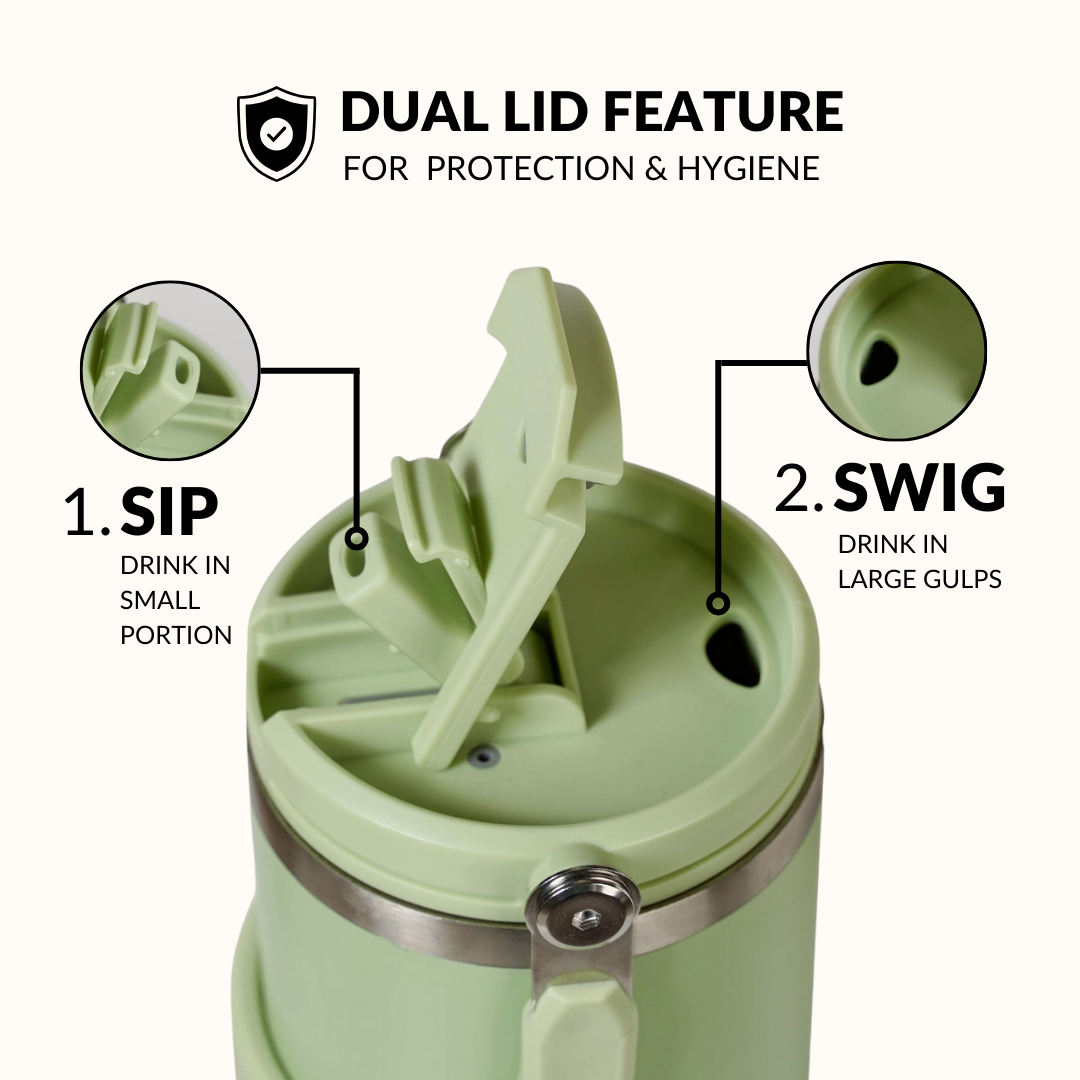 Design: This 1200ml stainless steel tumbler features a strong tri-ply insulated body with a clean, cylindrical form. It is topped with a dual sip & swig lid engineered with a secure, leak-resistant seal. A built-in top handle is seamlessly integrated into the lid for convenient carrying. The tumbler comes in a soft, muted green tone that gives it a fresh, clean, and modern look.