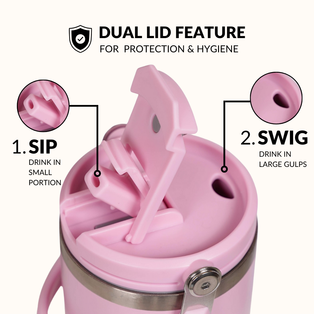 Benefits: The insulated body helps maintain beverage temperature for long stretches, whether hot or cold. Its generous size supports longer use between refills during busy routines, travel, or workouts. The secure sealing lid helps minimise spills while moving. The built-in handle allows for easy lifting and carrying. Multiple drinking openings provide flexibility and comfort with every use.
