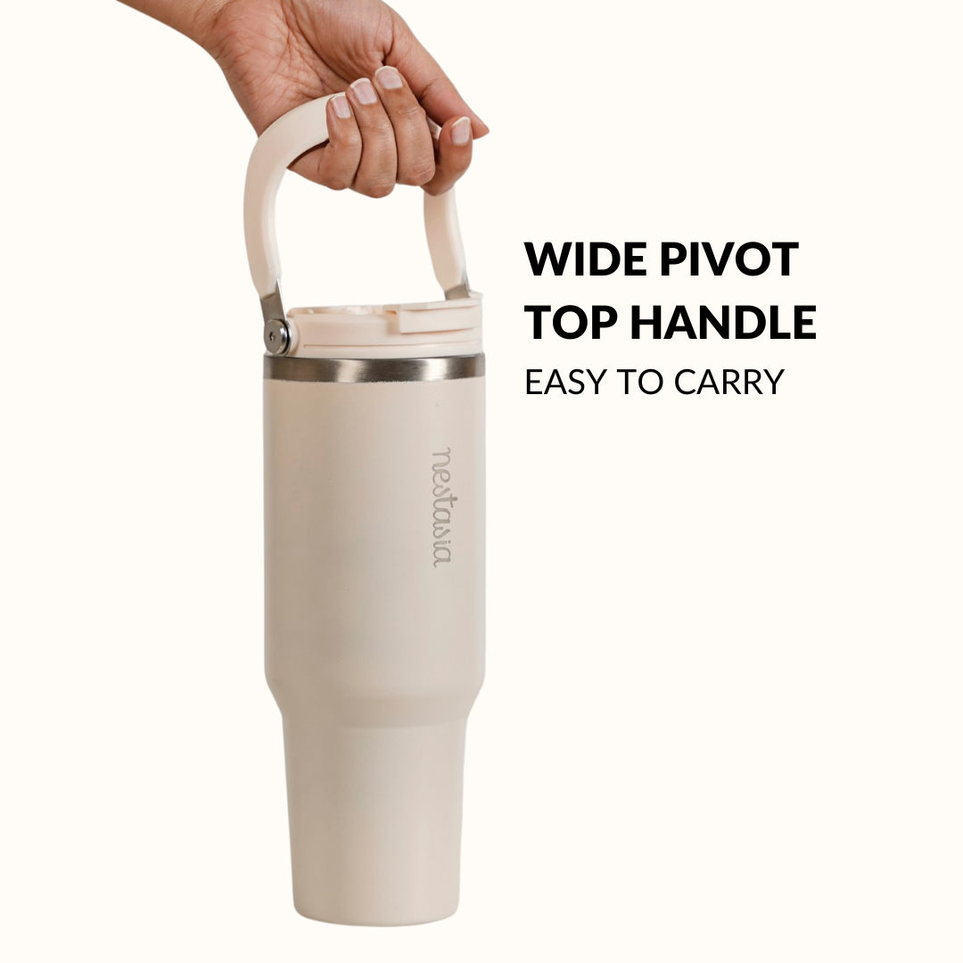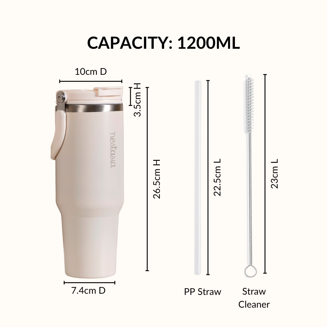 Design: This 1200ml tumbler is designed in a tall, slender profile with a smooth, uninterrupted surface and a clean, contemporary finish. Built from high-quality stainless steel, it features sturdy tri-ply insulated walls for a robust, layered form. The lid is equipped with dedicated sip and swig ports, a firm spill-resistant seal, and a strong top handle. This oatmilk white is a mellow off-white with gentle neutral depth, clean without being stark, refined without feeling cold, and quietly elevated for a modern, premium look.