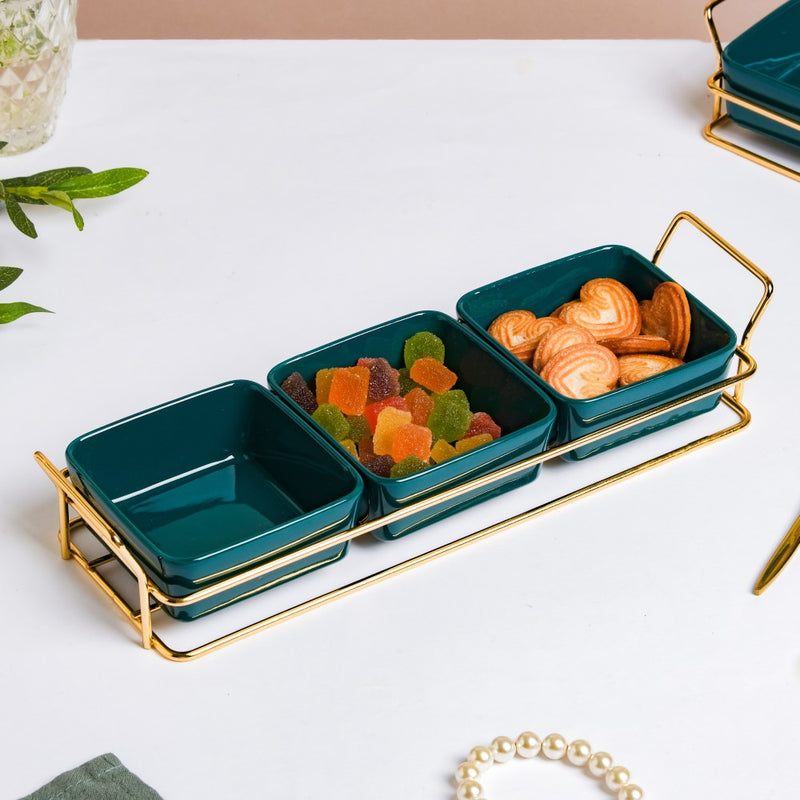Pine Green Glossy Ceramic Bowls And Tray Set Of 4 200ml