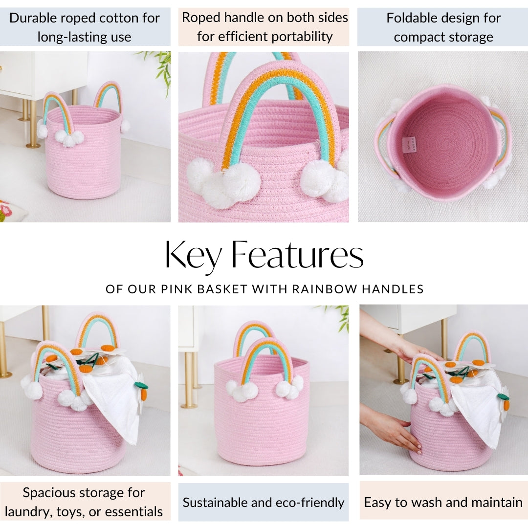 Brighten up your little one’s room with this dreamy storage basket, designed to bring a touch of magic to everyday organization. Featuring a pastel pink base with adorable rainbow handles and fluffy cloud pom-poms, this organising basket makes tidying up feel like a fairy tale. Easy to carry, it’s perfect for storing toys, books, clothes, and all your child’s little treasures. Whether used as a laundry basket or a charming room accent, this basket blends functionality with whimsical charm.