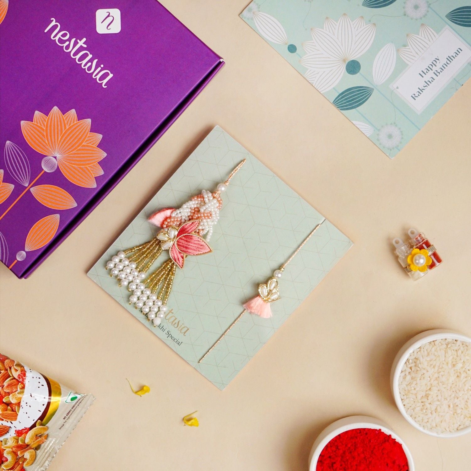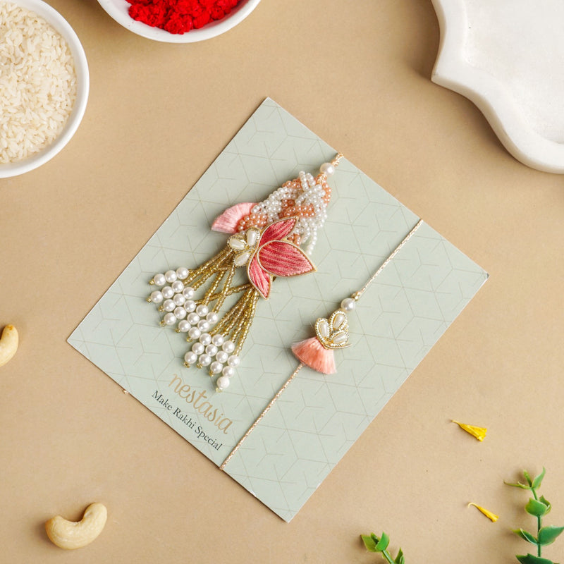 The rakhi and lumba are intricately adorned with clusters of pink beads, metallic charms, and threads that are naturally woven in. The soft blush tones paired with golden highlights give the set a festive yet refined feel - perfect for someone who appreciates the little things done beautifully. With matching details in both bands, the set mirrors the harmony and warmth your relationship holds.