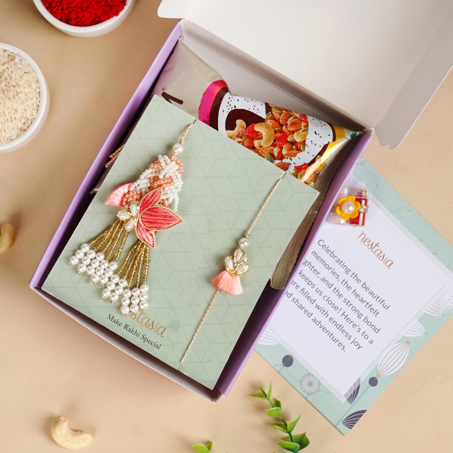 The complete gift set includes a rakhi and lumba duo, a roli chawal bottle set for the ritual, a pack of mixed dry fruits, a wish card, and an elegant gift box to tie it all together.