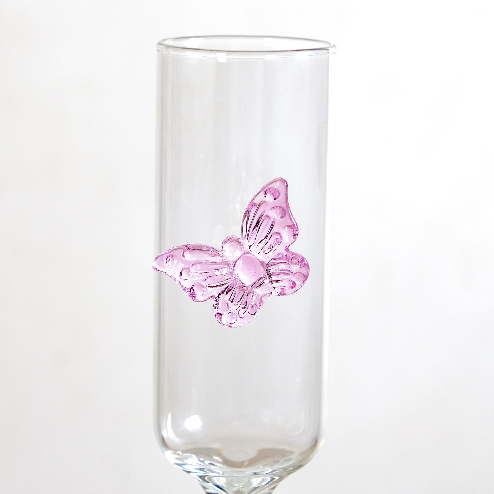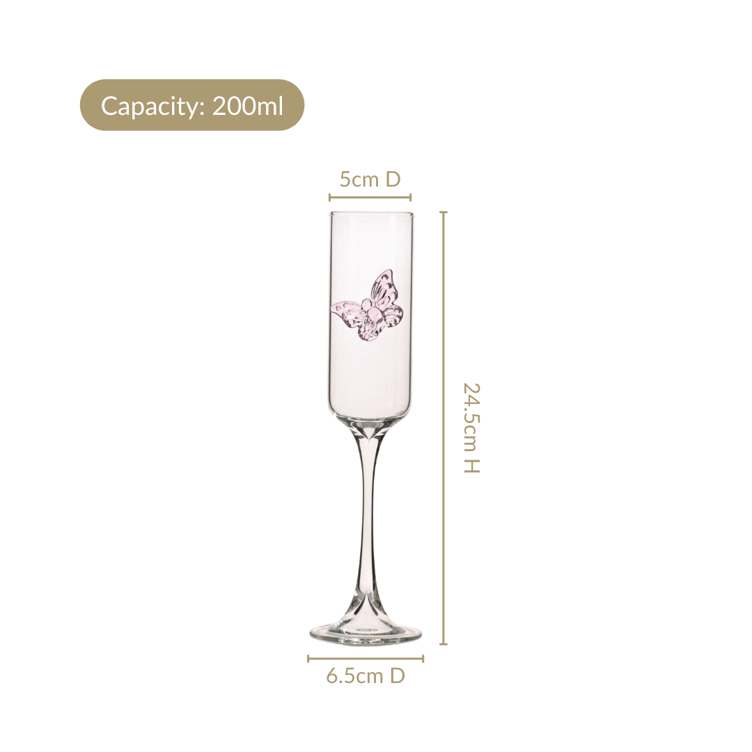 Design: Expertly shaped from borosilicate glass, this tall champagne flute features a slim, elongated bowl and a refined, slender stem that creates an elegant, airy silhouette. At the centre sits a blush-pink butterfly sculpted in textured glass. Its soft tint and detailed wings add a delicate decorative touch while keeping the flute’s classic form intact.