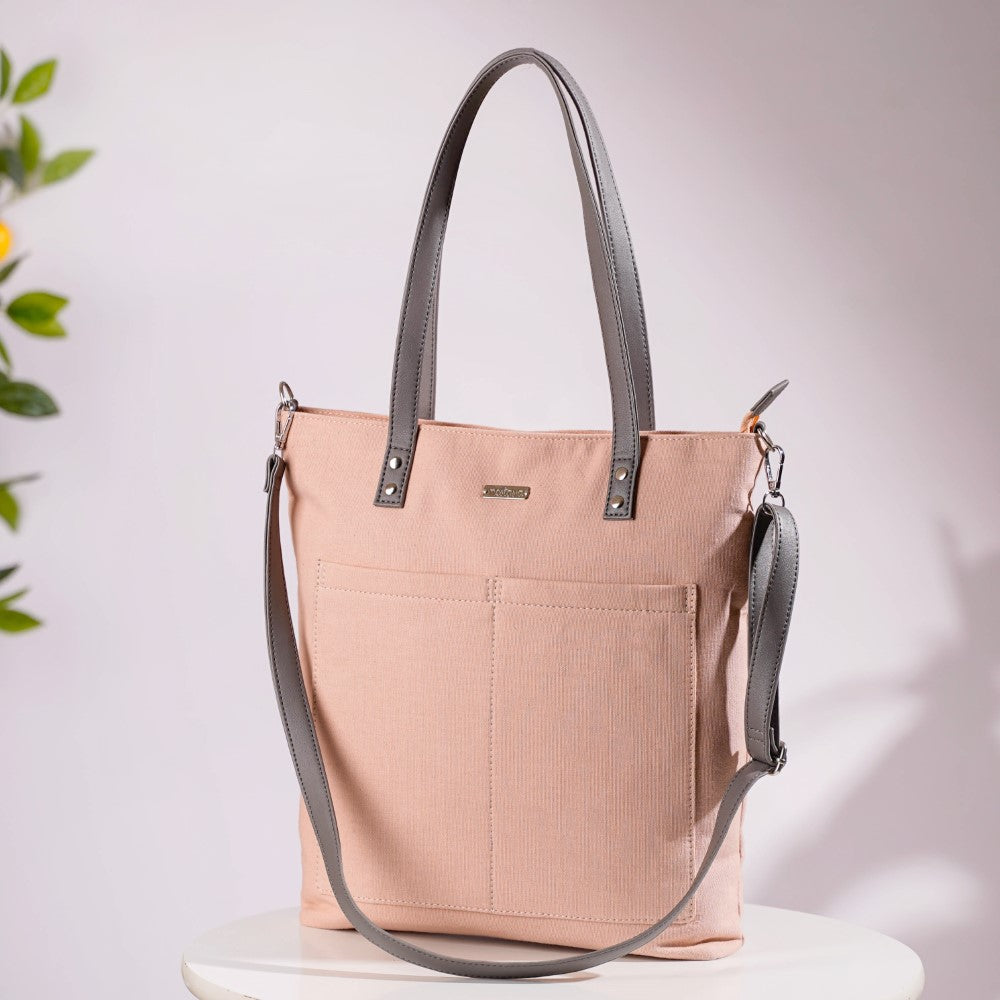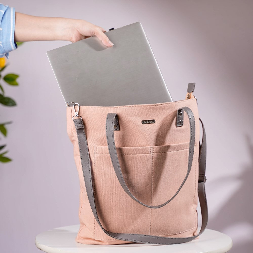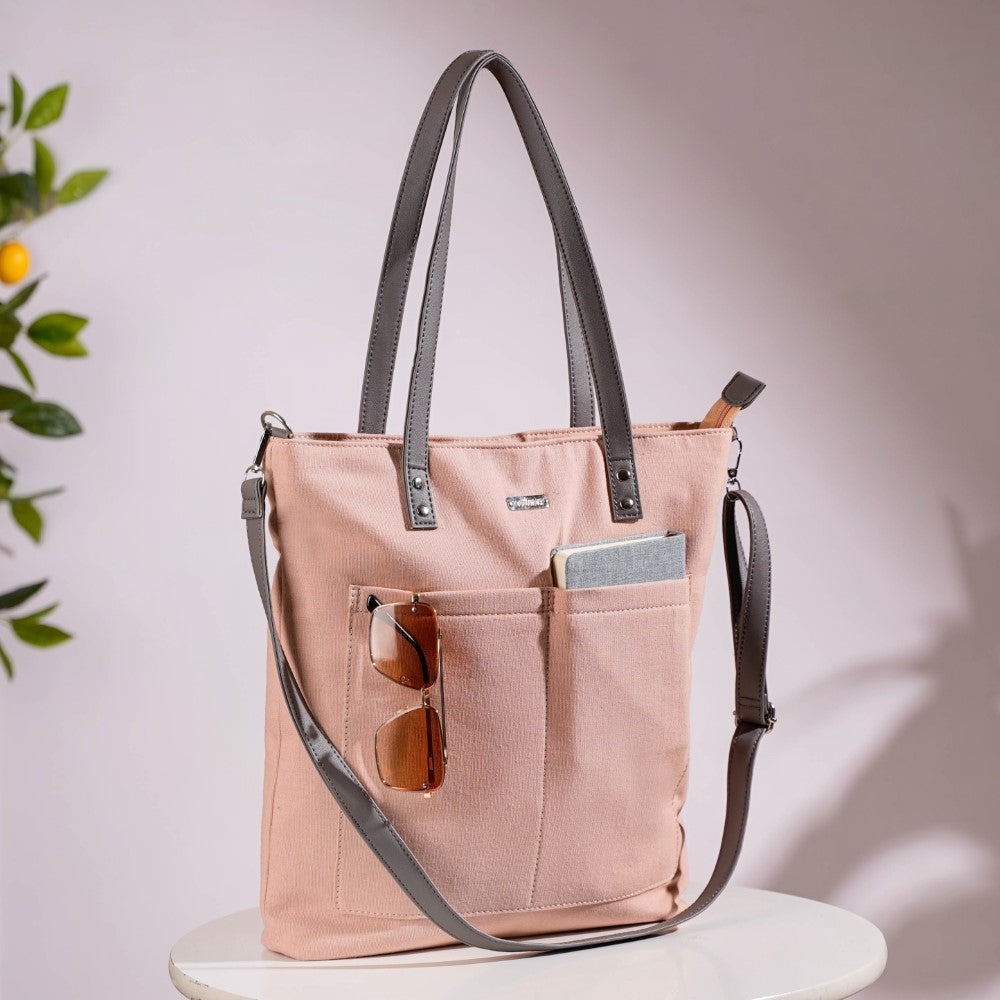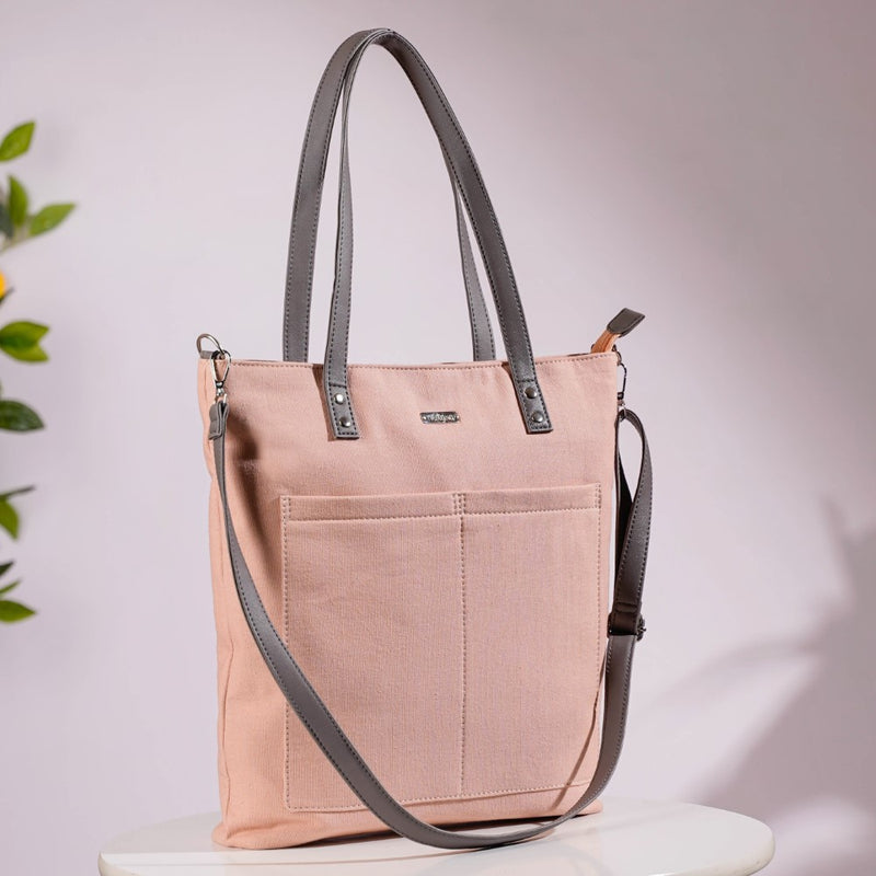 The pink cotton tote bag can easily double as a laptop bag or a regular office bag, thanks to its durable and lightweight design. The tote bag also comes with two compartments on the outside and two on the inside to safely carry your notepads, purse, mobile phone, sunglasses, and other personal belongings. The spacious interior and the smooth zipper system help to conveniently fit your laptop and other belongings inside the cotton tote bag without misplacing anything. Not to mention, the stylish and attractive design of the tote bag makes it ideal for gifting purposes.
