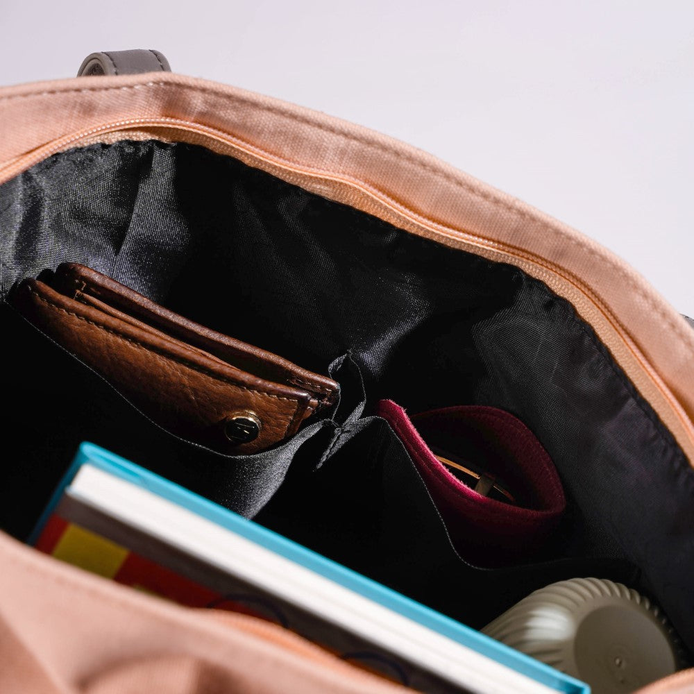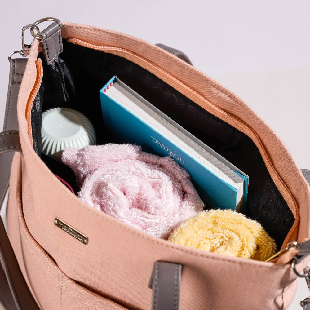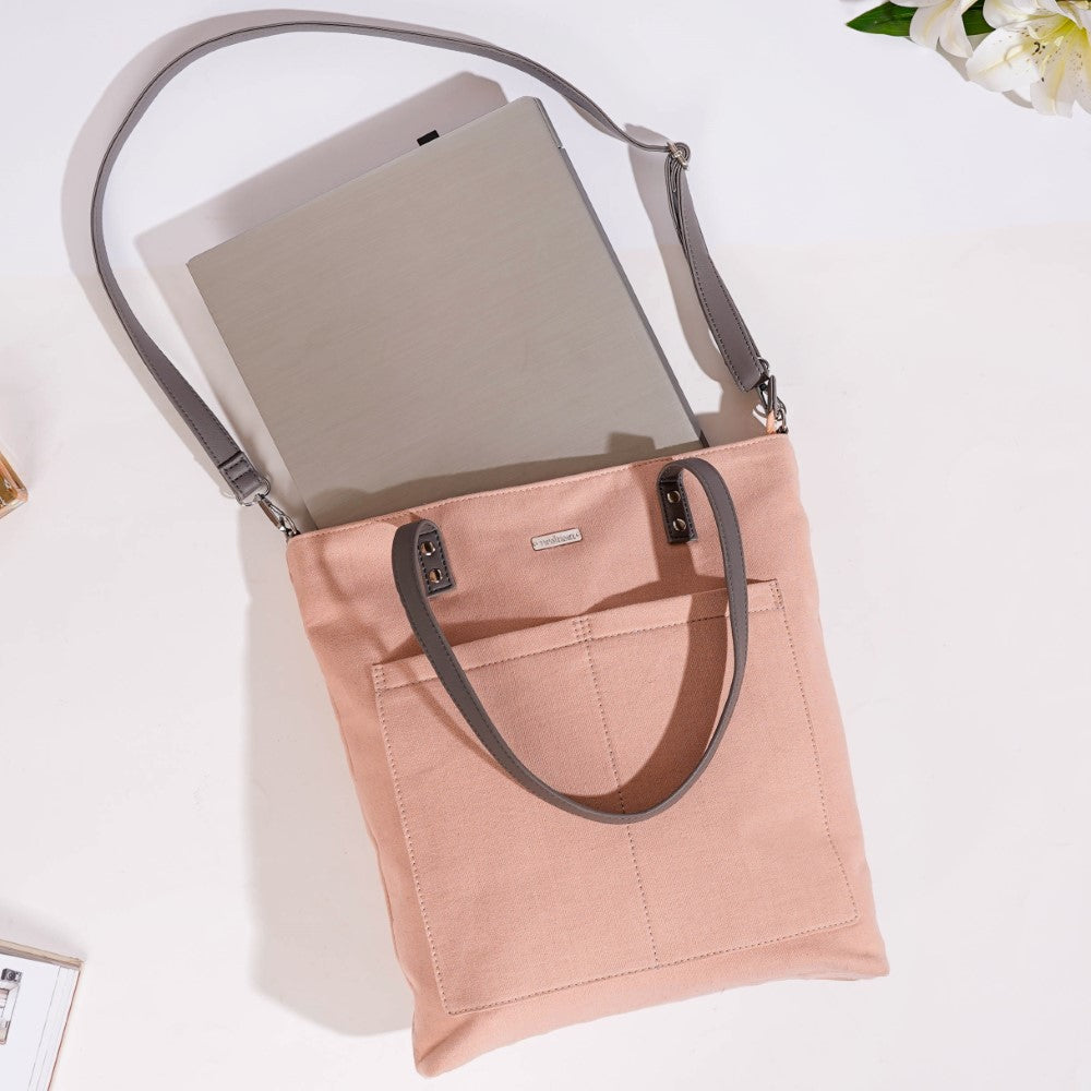 The pink cotton tote bag can easily double as a laptop bag or a regular office bag, thanks to its durable and lightweight design. The tote bag also comes with two compartments on the outside and two on the inside to safely carry your notepads, purse, mobile phone, sunglasses, and other personal belongings. The spacious interior and the smooth zipper system help to conveniently fit your laptop and other belongings inside the cotton tote bag without misplacing anything. Not to mention, the stylish and attractive design of the tote bag makes it ideal for gifting purposes.