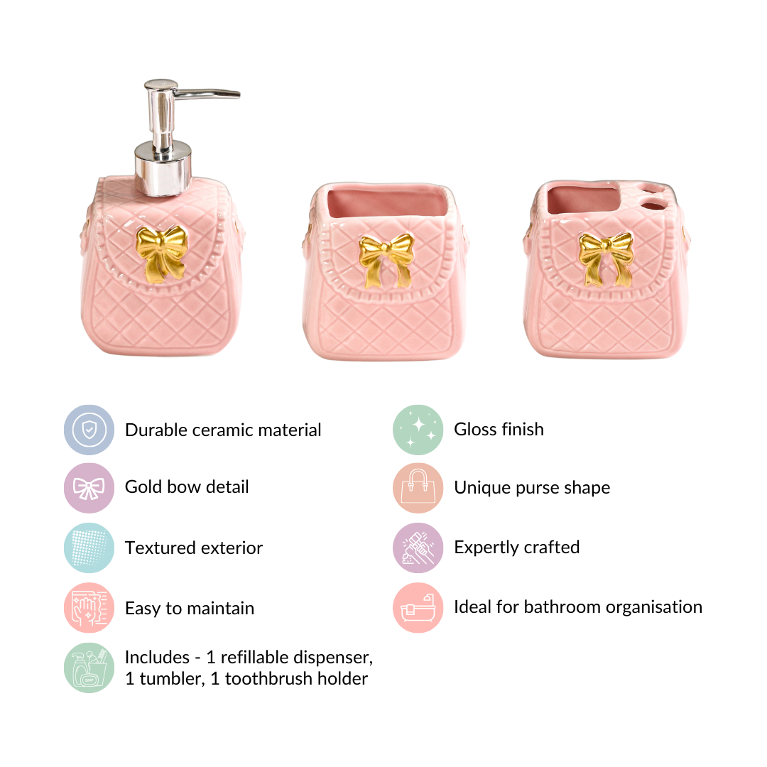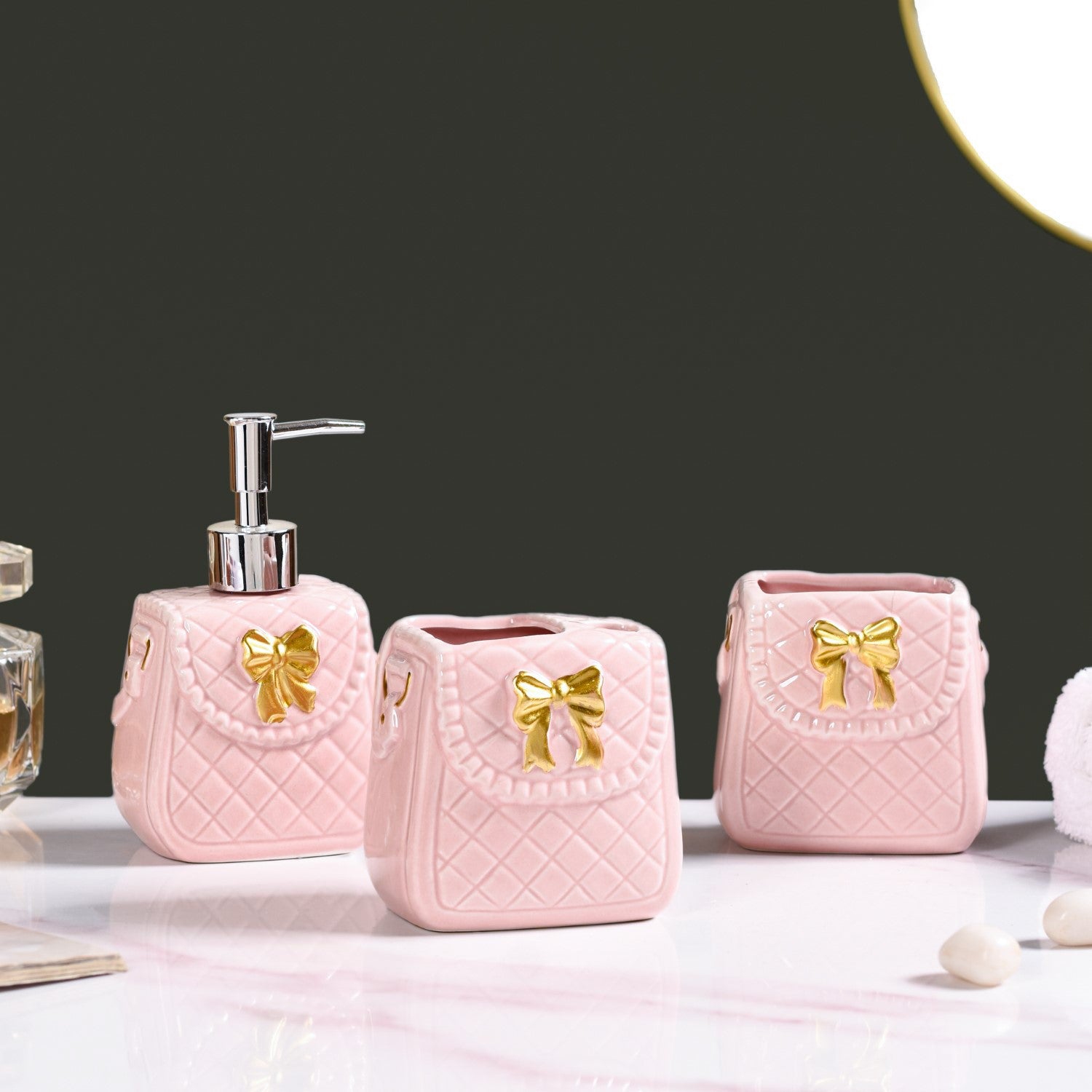The purse-shaped design of the ceramic bath set is a unique blend of elegance, playfulness, and eye-catching detail that adds character and charm to your bathroom space. It's more than a functional set; it's a stylish accessory that reflects your personality and taste.