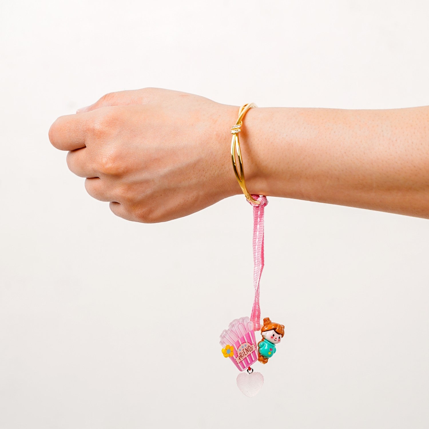 Our cute pink Rakhi gift hamper is just the right pick for little sisters. The pretty pink ribbon is attached to a PVC material, which is also coloured pink and cut out in the shape of French fries with the text 'friends'. Along with that, it has a tiny doll with chubby cheeks and a crystal pink heart charm tied to it. The package includes 1 Rakhi, 1 packet of dry fruits, 1 wish card, and 1 roli chawal bottle set.
