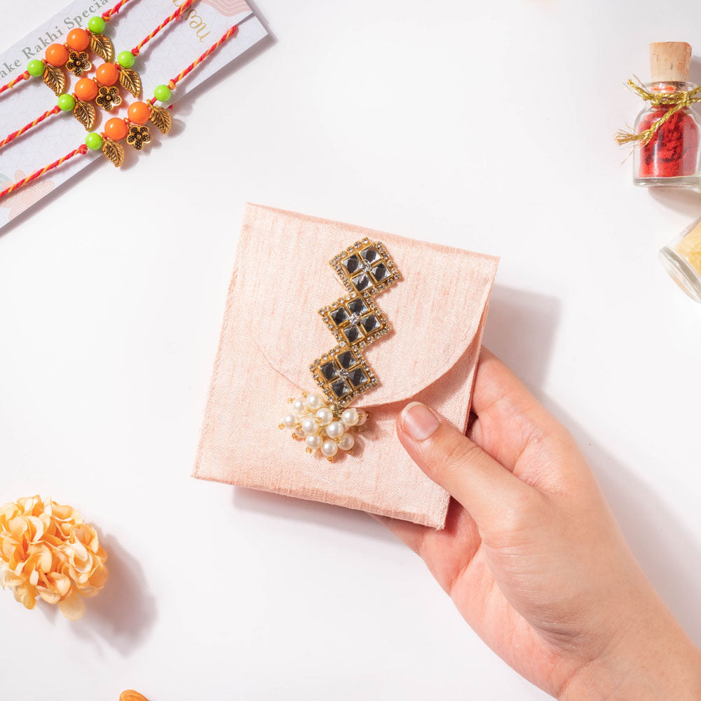 For your "ek haazaro mein, meri behna hai", we have got the most adorable and glam envelope as you offer a token of your admiration in the form of a rakhi. The pink rakhi envelope is beautified by some rhinestone-like crystals which makes it match the glitz of the festival.