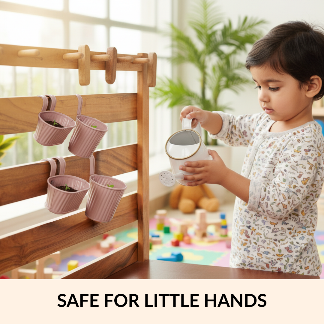 Benefits: The iron body provides durability and stability for repeated use while remaining compact and easy to handle. The ribbed surface adds grip and helps the planters keep their shape over time. Built-in hooks allow flexible placement without extra hardware. Drainage holes support healthier plants by preventing water buildup. The small size makes these planters ideal for first gardening attempts, limited spaces, or supervised use by children, less soil, less mess, fewer “uh-ohs.”