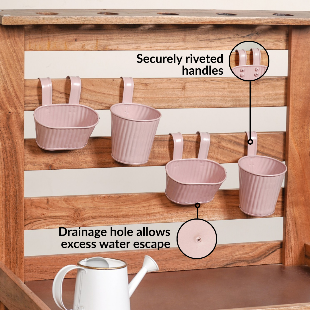 Design: This mini planter set includes four small metal planters in complementary shapes, one round and one oval. Each planter is made from iron with a ribbed exterior that adds texture and structure. The soft matte pink finish gives a calm, nature-inspired look. Curved hanging hooks are integrated into the body, allowing the planters to rest securely on rails, pots, or edges. A single drainage hole is placed at the base of each planter, and the rims are smoothly rolled for a neat, finished appearance.