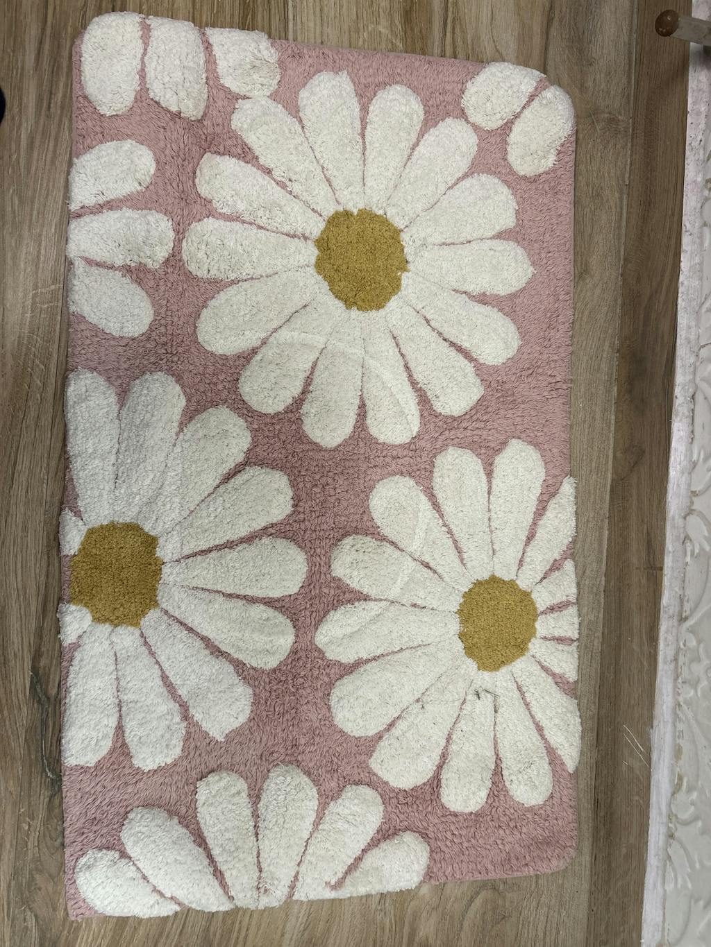 Design: This rectangular cotton floor mat showcases a cheerful and lively design, featuring five daisy flowers arranged across a soft blush pink background. Each daisy is centered with a warm yellow circle, surrounded by thick, white, elongated petals that radiate outward. The petals are densely tufted, creating a plush, three-dimensional texture that stands out against the pink base. The flowers are positioned at varying angles and slightly overlap, lending the mat a relaxed, organic layout that adds movement and visual interest to the design.