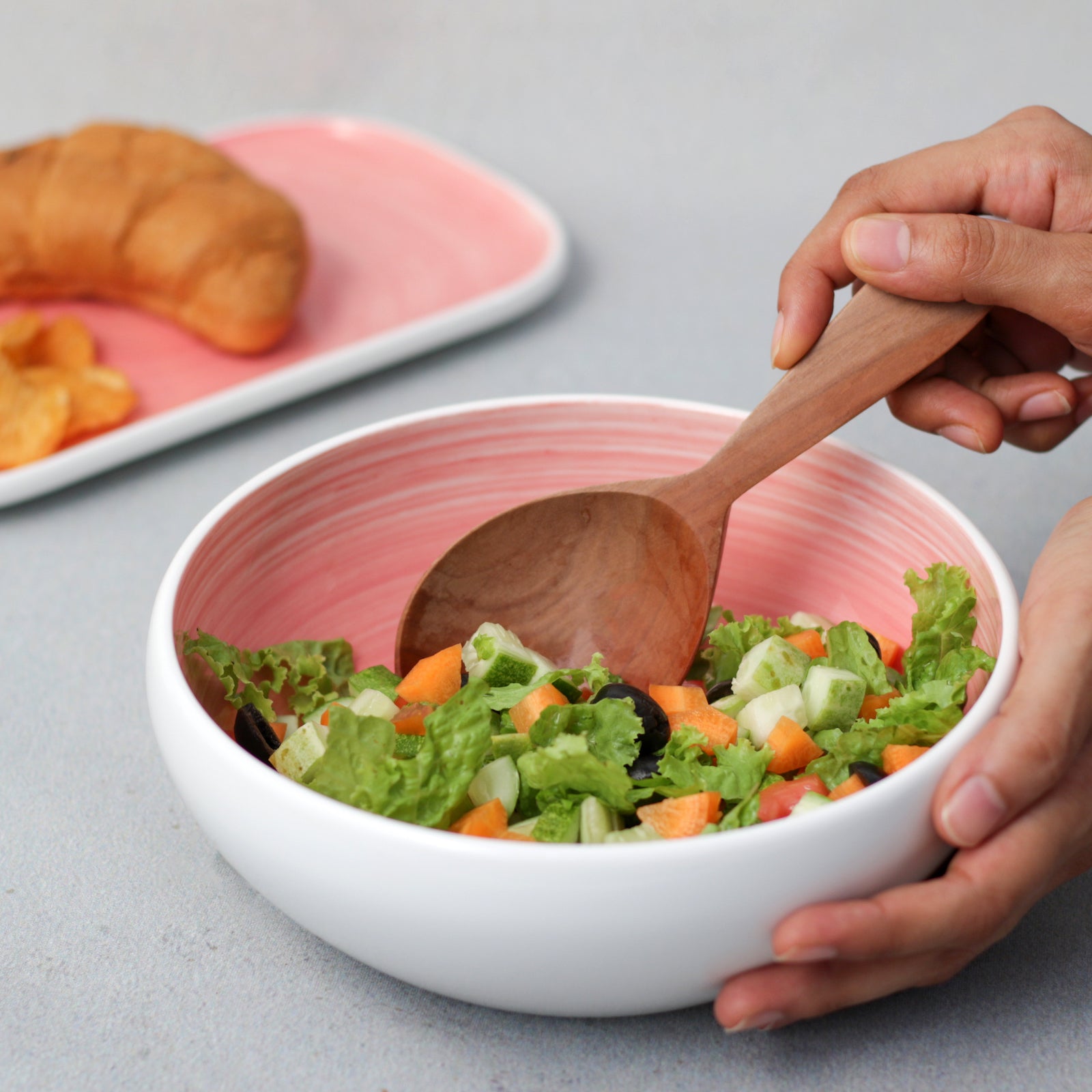 The pink serving bowl has a two tone combination in pink and white. The brush stroke effect enhances the look of the serving bowl. The curry bowl can be used to serve soup, stews and curries. The rice will uplift the look of the table setting. A variety of cuisines can be served as the colour is subtle which will enhance the look of the food.