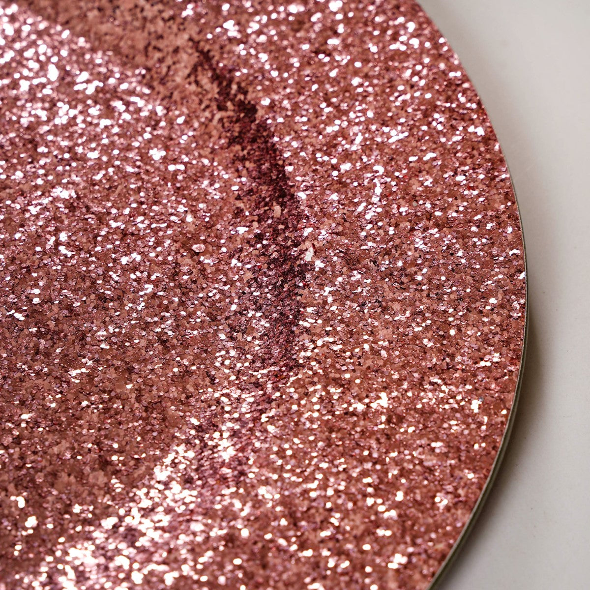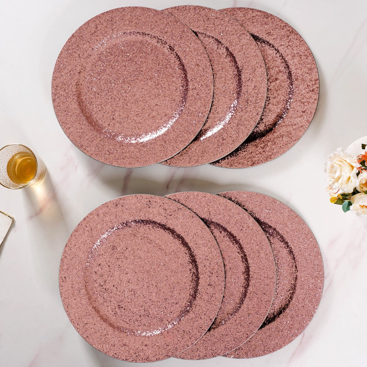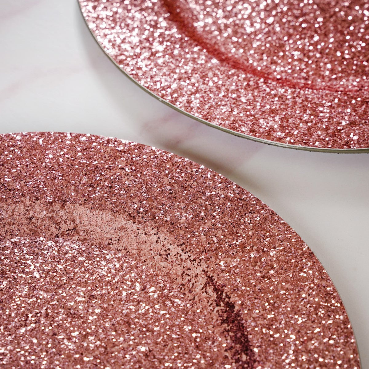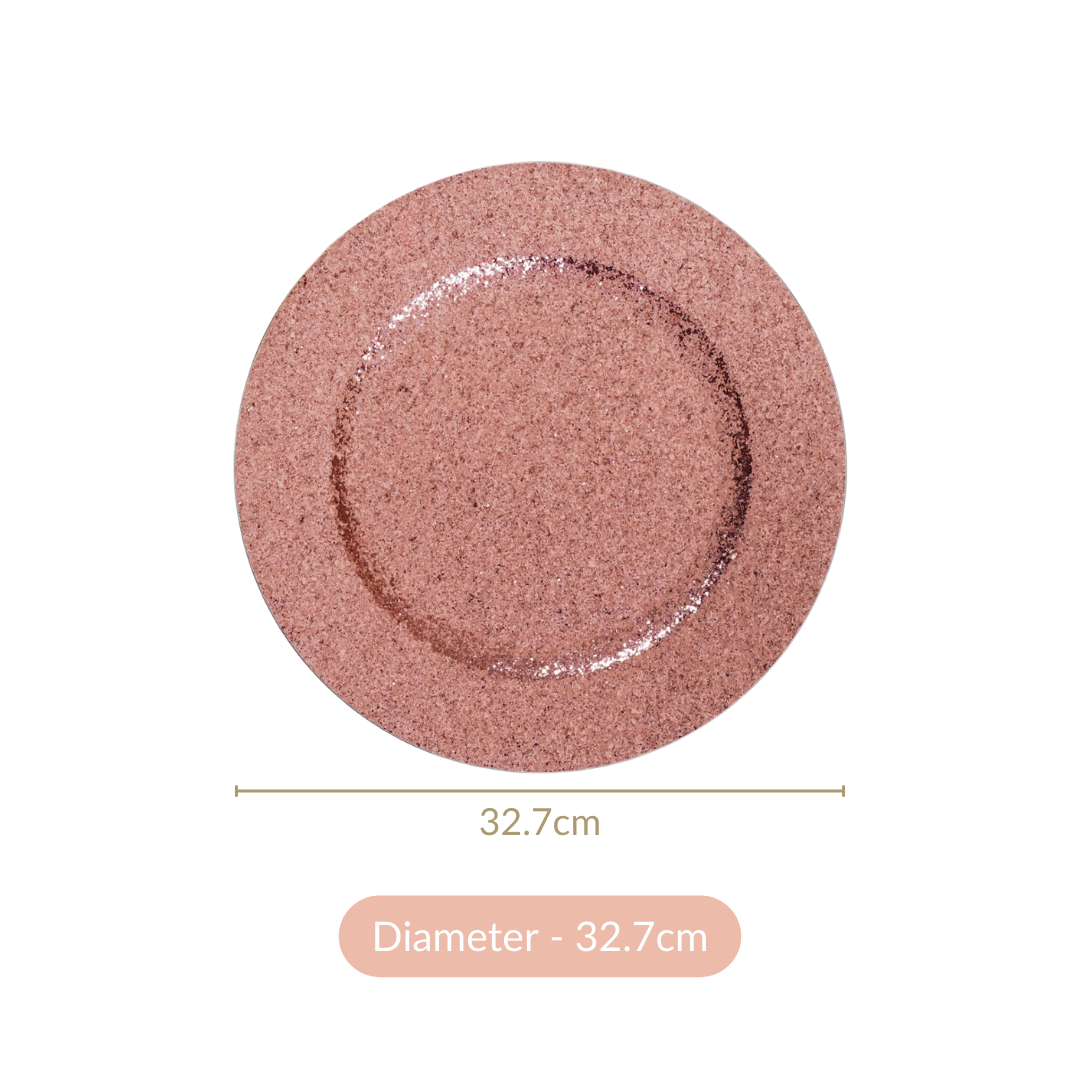 The pink shimmer charger plate is crafted from premium-quality material, ensuring durability and longevity. It's designed to withstand regular use, making it a reliable choice for all your special occasions. The meticulous attention to detail in its construction ensures that it can maintain its elegance and quality over time.