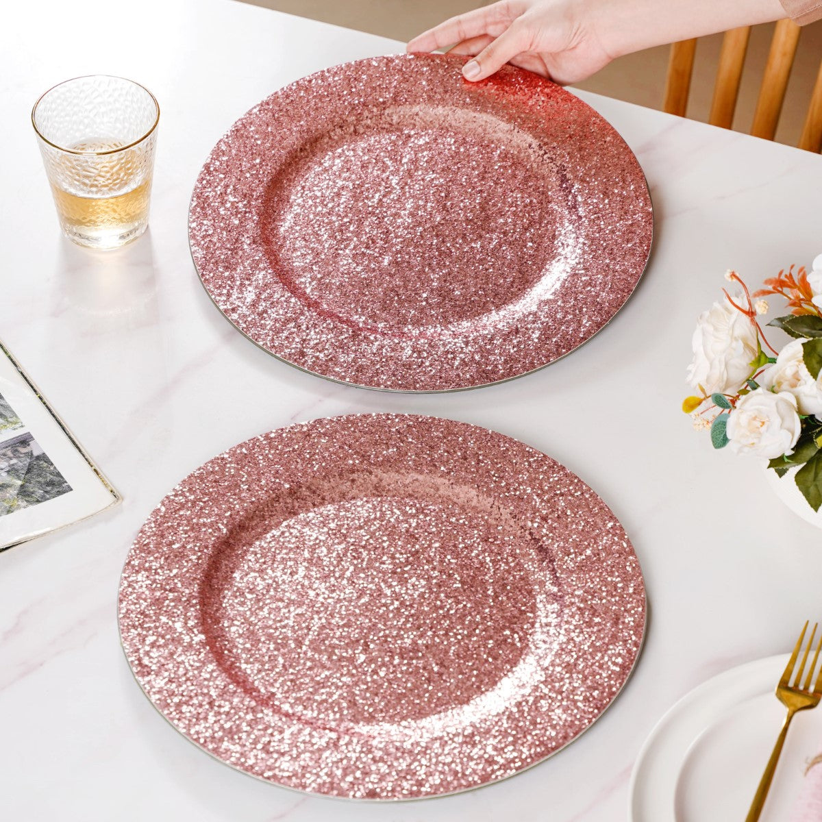 The pink shimmer charger plate acts as a protective barrier for your dinner table. It prevents accidental food spills and stains, preserving the appearance of your table. This ensures that your table linens and surfaces stay in excellent condition while you enjoy your meals with peace of mind.