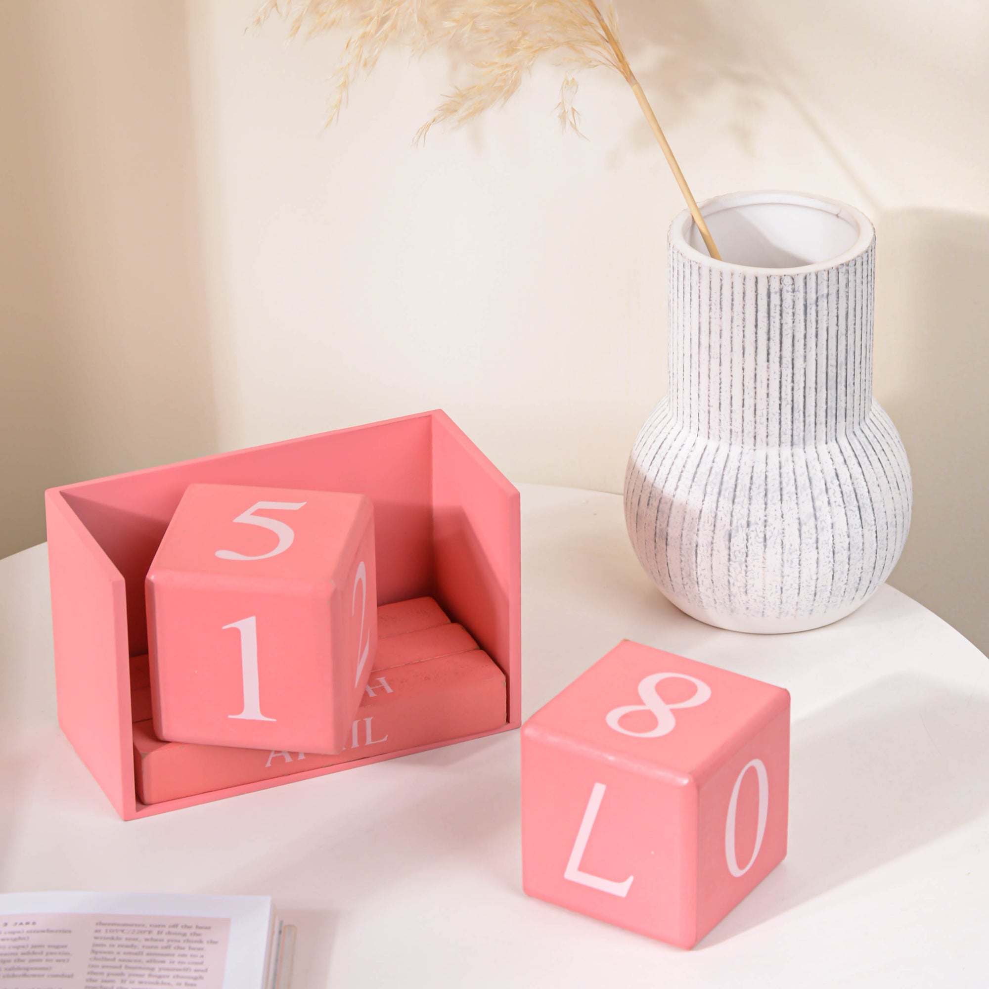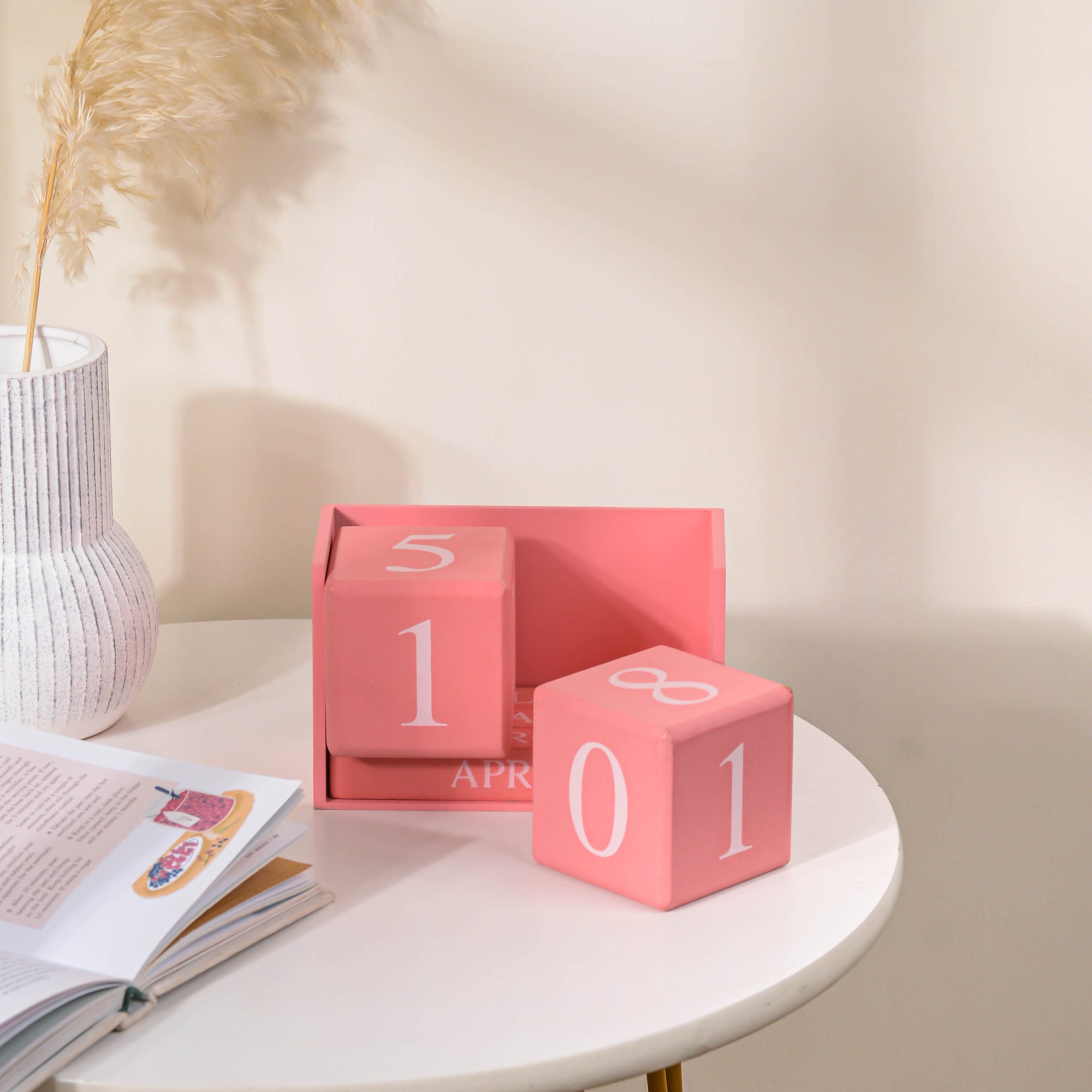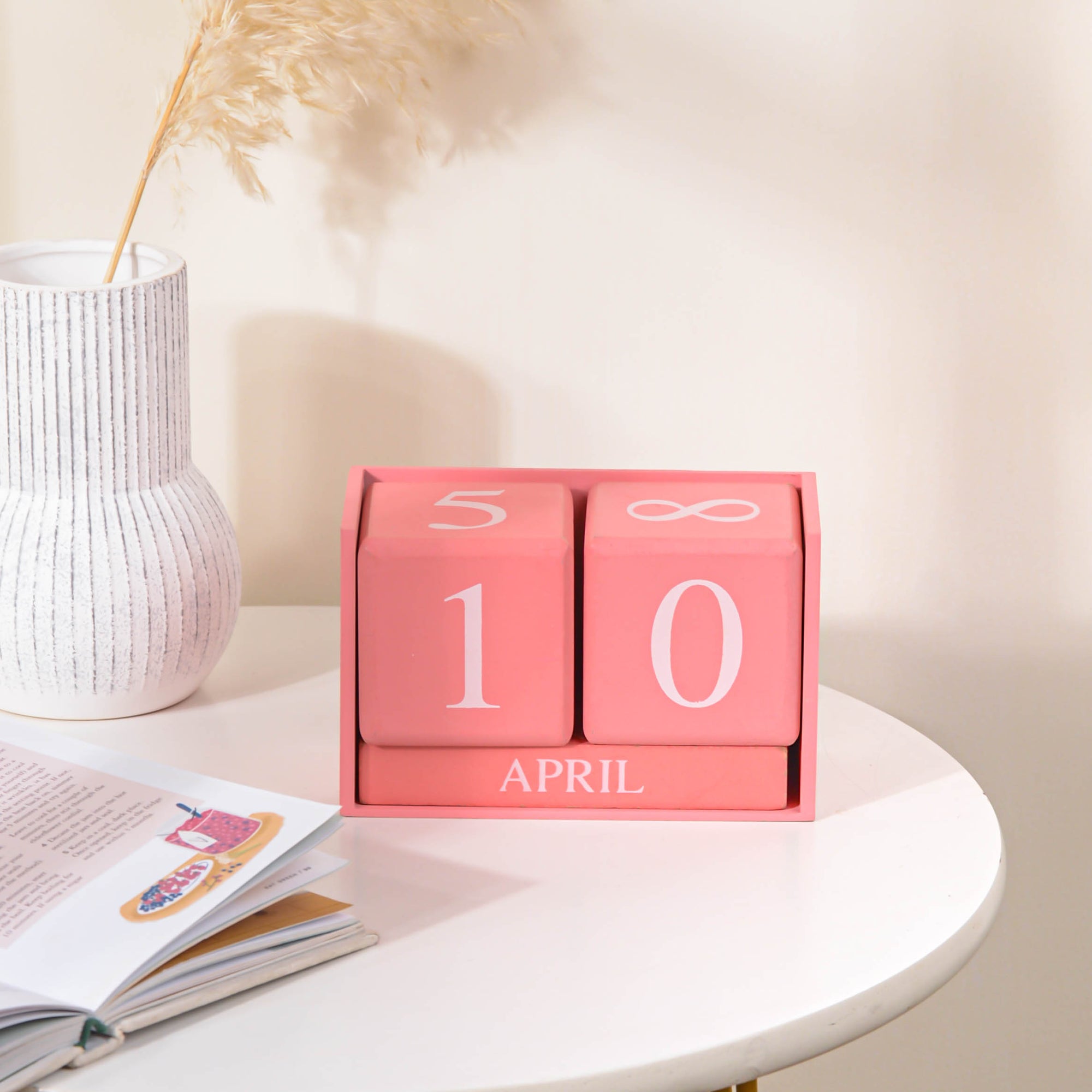 A wooden table calendar that one can flip every day to begin their day on a bright note. The calendar can be used as a display piece on a table, shelf, or display unit. The calendar in pink and white consists of wooden blocks to change the date and month. The calendar is an excellent decor piece to use on the office desk.