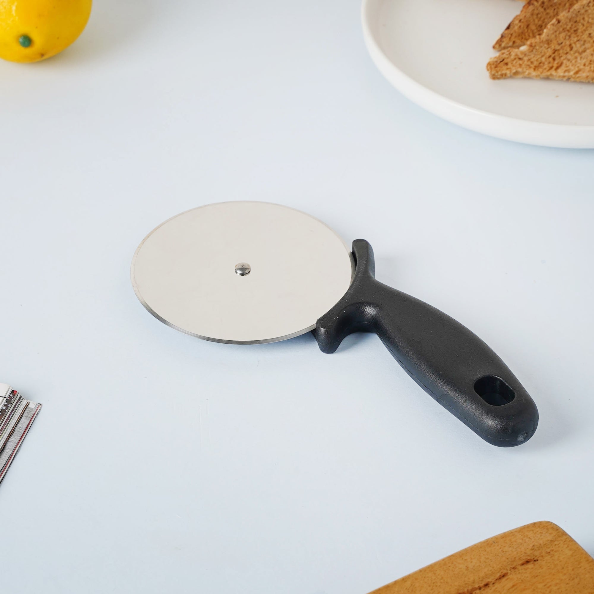 The pizza cutter with the black handle made of PVC is simple and easy to use. Once the slices are cut out, simply dig into that yummy pizza.