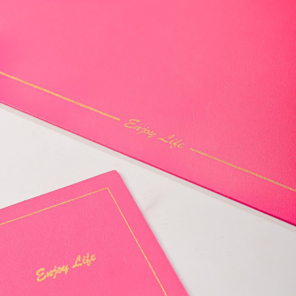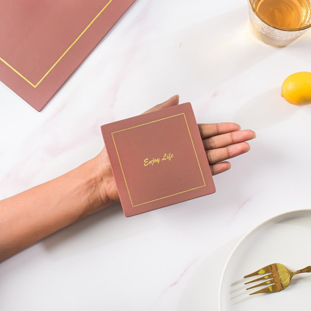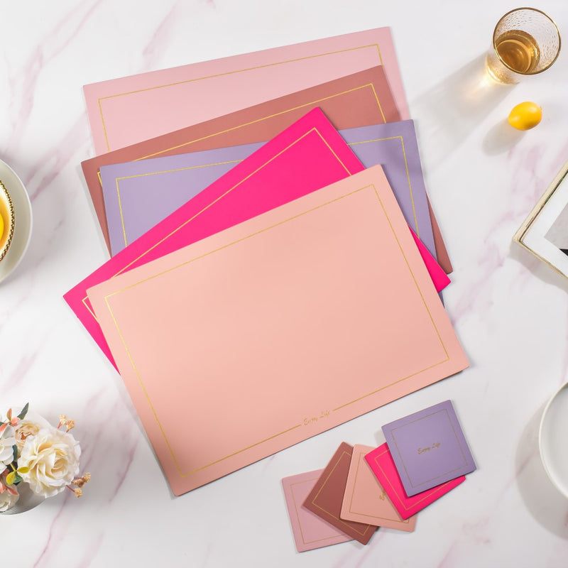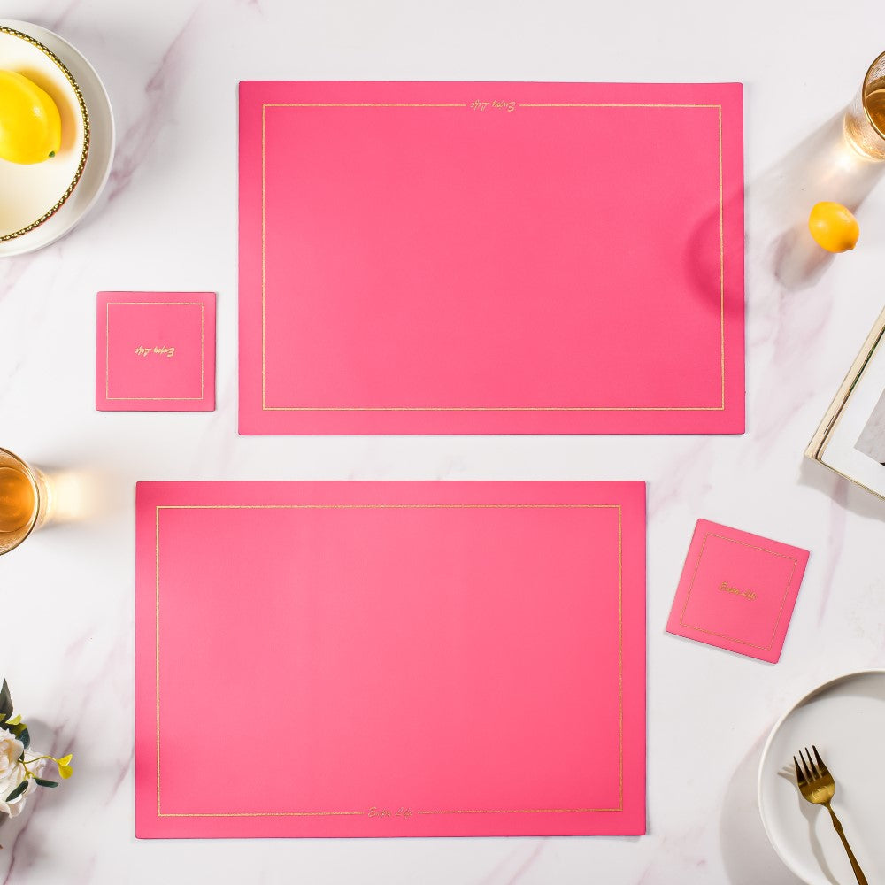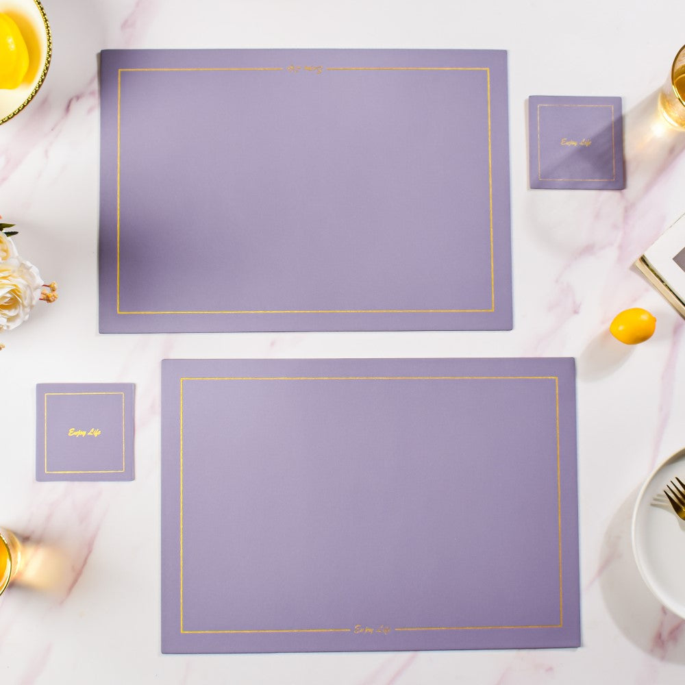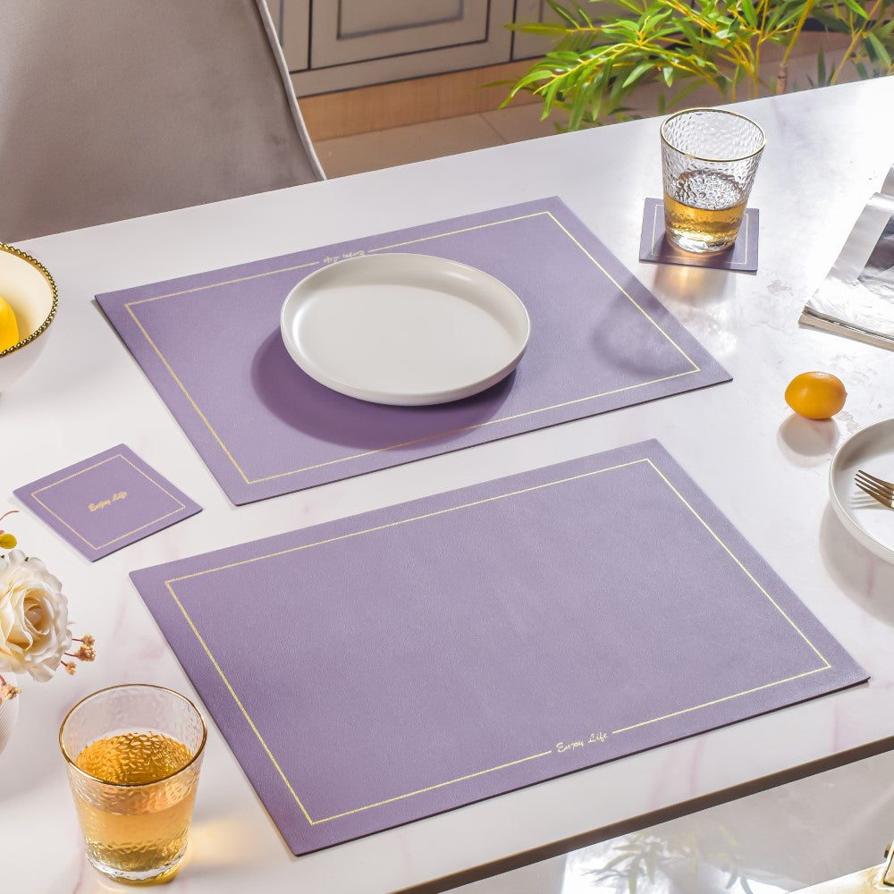 Set of placemats and coasters in the same hue that is made of leather. The dinner table mat, together with the coaster, may help to define and arrange a meal setting. The set may be used for everyday meals as well as for special occasions when entertaining guests. The table is protected by the dining mat from scratches, spills, and stains.