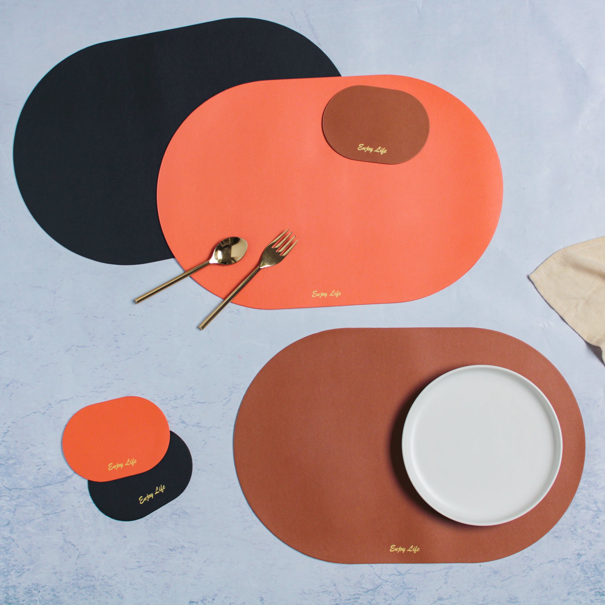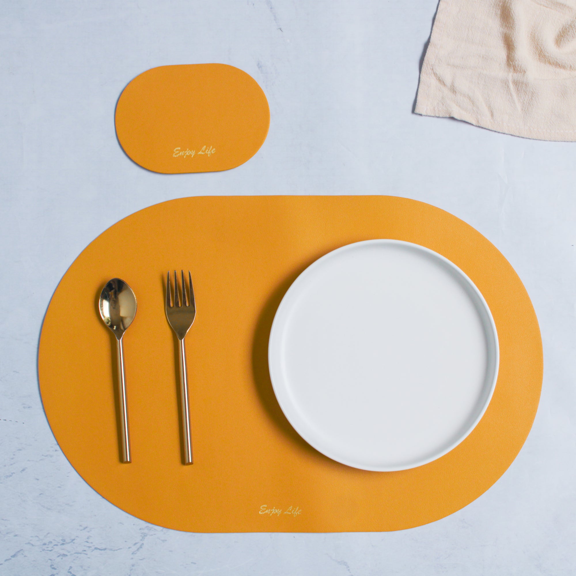 Placemat and coaster set that is made for modern-day dining and home settings. The set of table mat and coaster comes in vibrant color options and a stylish shape that can definitely be an eye-catcher at a dinner party. The insulation placemat protects the table from heat, scratches, and stains. The glass coaster can be used with the dining mat or can also be used individually as a teacup coaster. The mat for the dining table can also be used on the bedside table or at a work desk to give it a visual appeal or to organize any space.