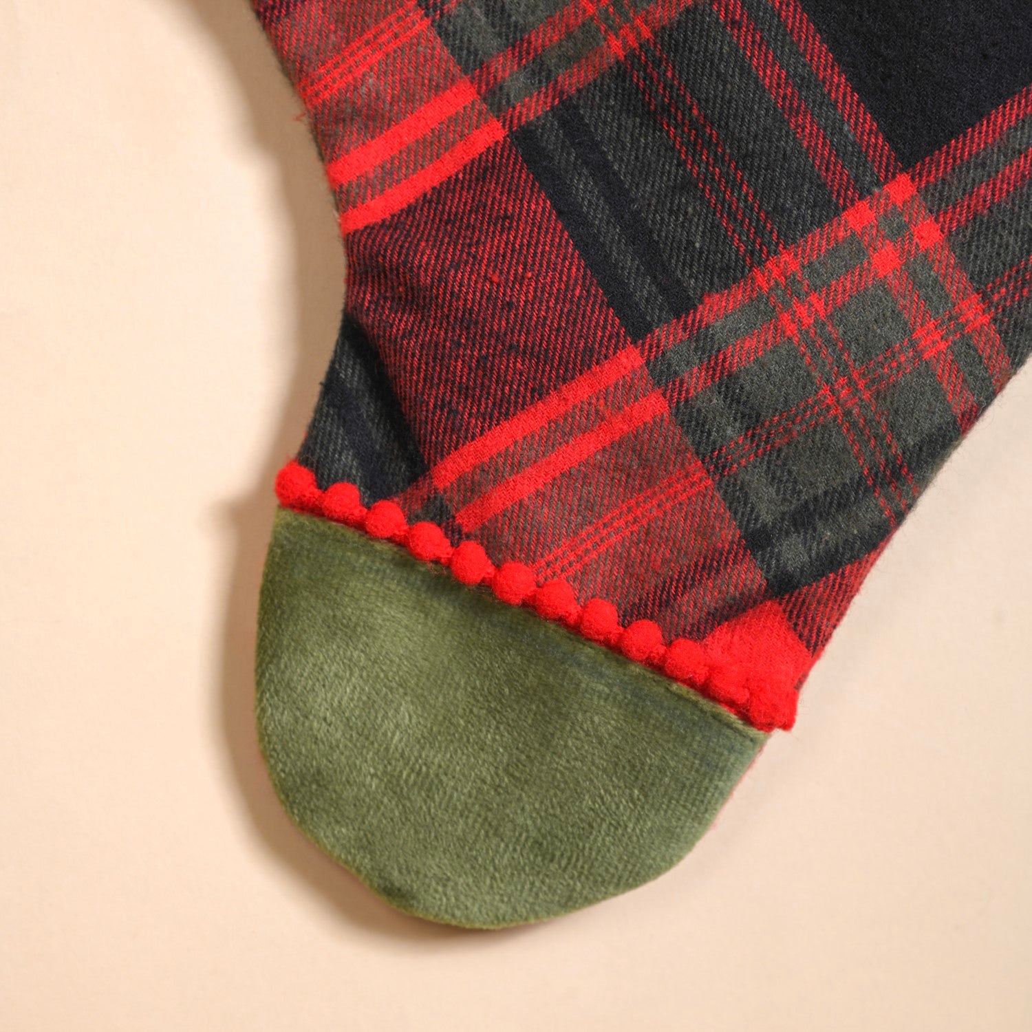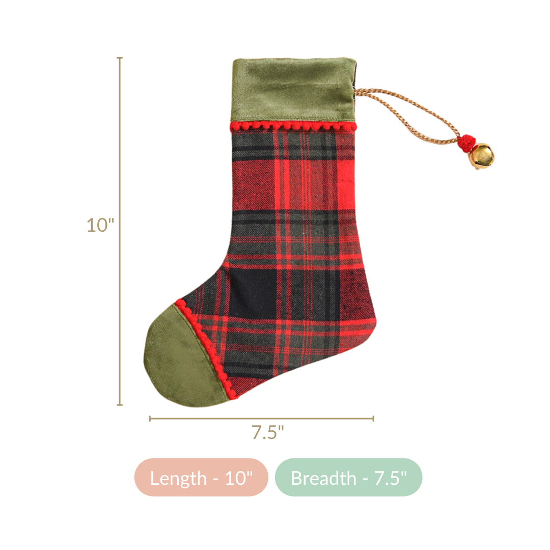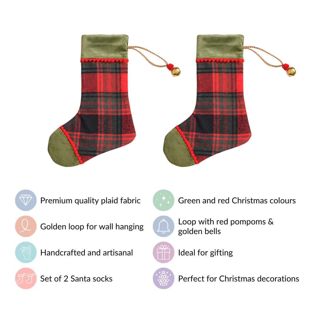 Yes, the handcrafted set of 2 Santa socks is designed to be versatile and suitable for both contemporary and traditional decor styles. The classic plaid fabric in vibrant green and red hues, along with the golden loop, red pompoms, and golden bells, adds a timeless and festive touch to any setting.