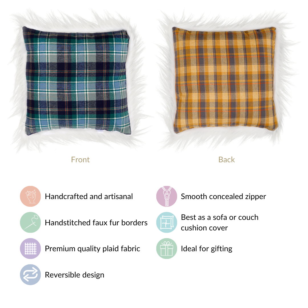 The standout feature of this plaid cushion cover is the reversible design with the same fabric edging, providing a clean look on both sides. The edges of the cushion cover are adorned with luxurious fur, adding a touch of warmth and sophistication to the plaid pattern in blue.