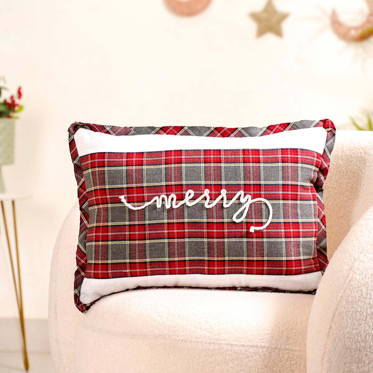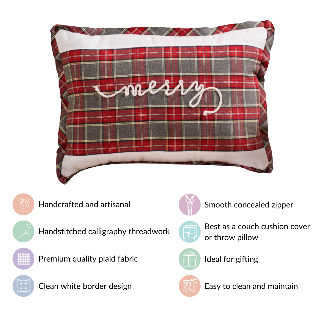 Our Christmas-themed plaid cushion cover stands out with its classic red and green plaid pattern adorned with clean white borders on the top and bottom. The combination of traditional plaid and modern calligraphy creates a harmonious blend that complements various decor styles, making it a versatile and distinctive choice for the season.