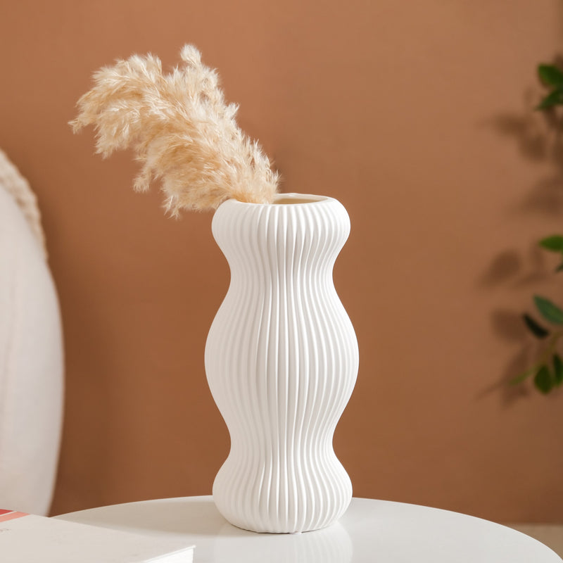 Cloaked in a muted glaze, the ceramic vase wears a tranquil palette that evokes the hush of a misty morning. Its unassuming beauty lies in its quiet subtlety, where less becomes more, and the serene allure of ceramic takes center stage. The vase's surface is adorned with subtle pleats, each one a whisper of artisanal craftsmanship. these gentle contours create a tactile landscape that beckons the fingertips, inviting touch as much as admiration.