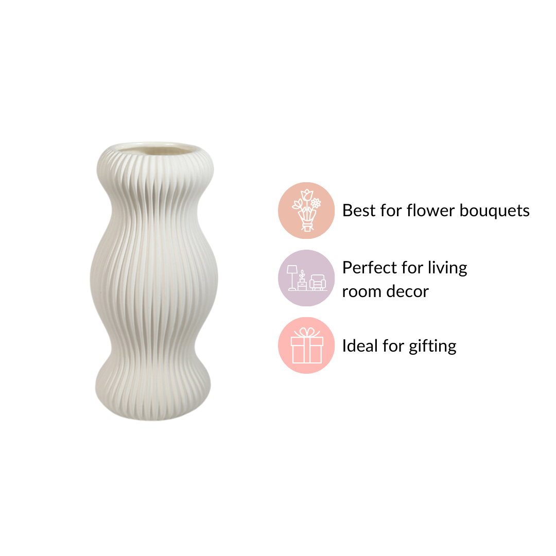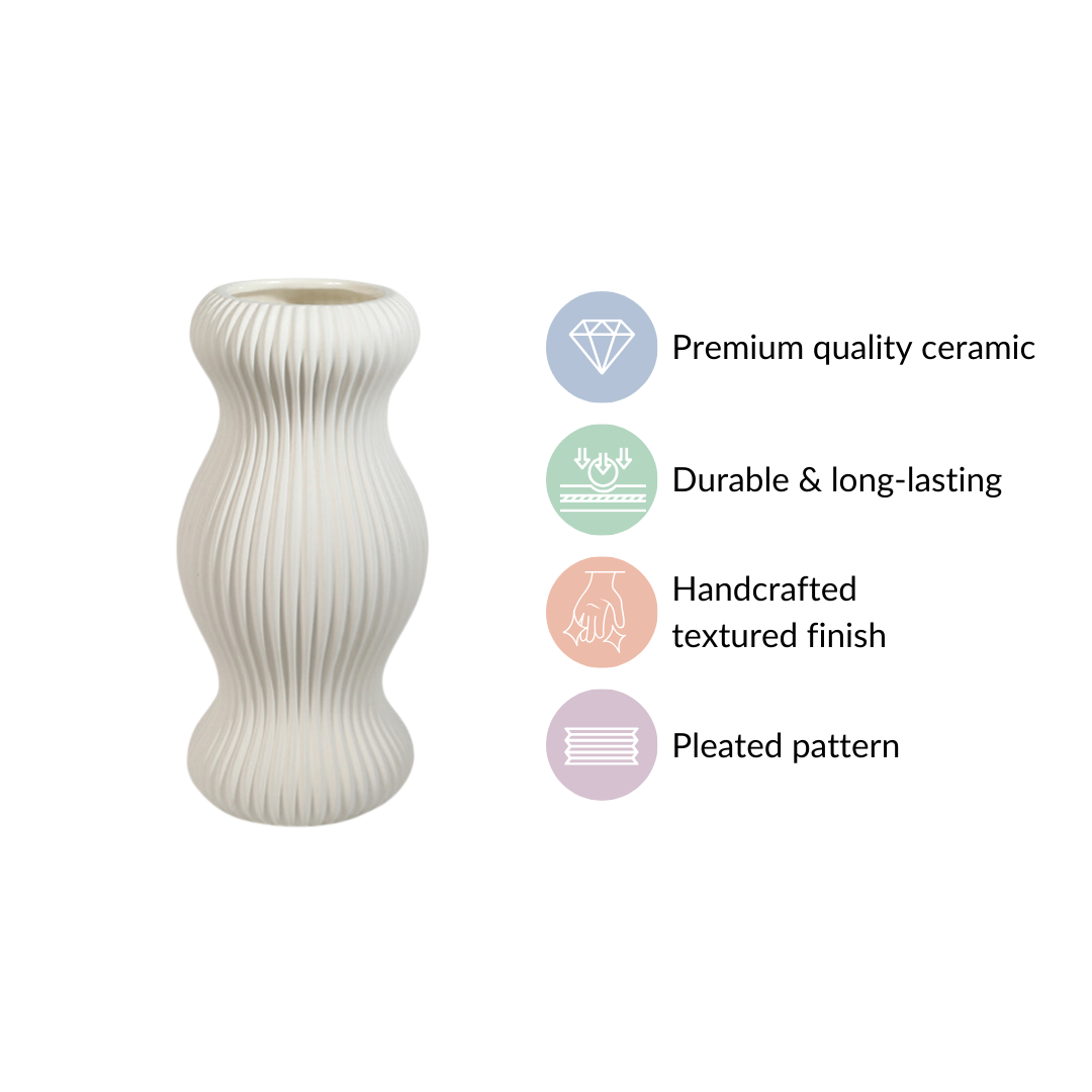 What makes this ceramic vase stand out as a decorative piece are its exceptional attributes. Crafted from premium quality ceramic, this vase promises durability and longevity, ensuring it will grace your decor for years to come. The handcrafted textured finish adds an artistic and tactile element, making the vase visually captivating and unique. Its minimalistic design allows it to seamlessly integrate into various decor styles, providing versatility in your home decor.