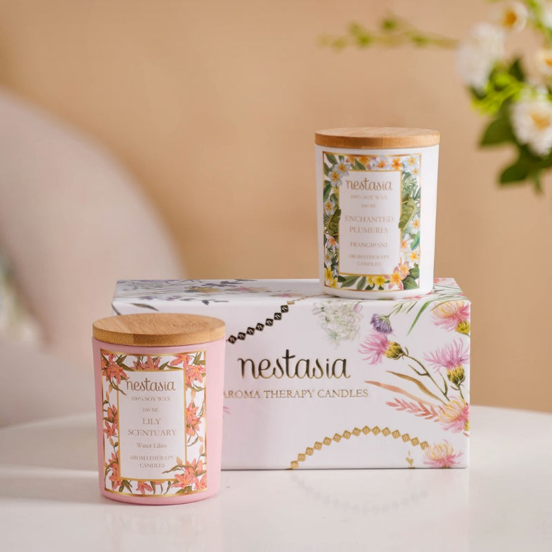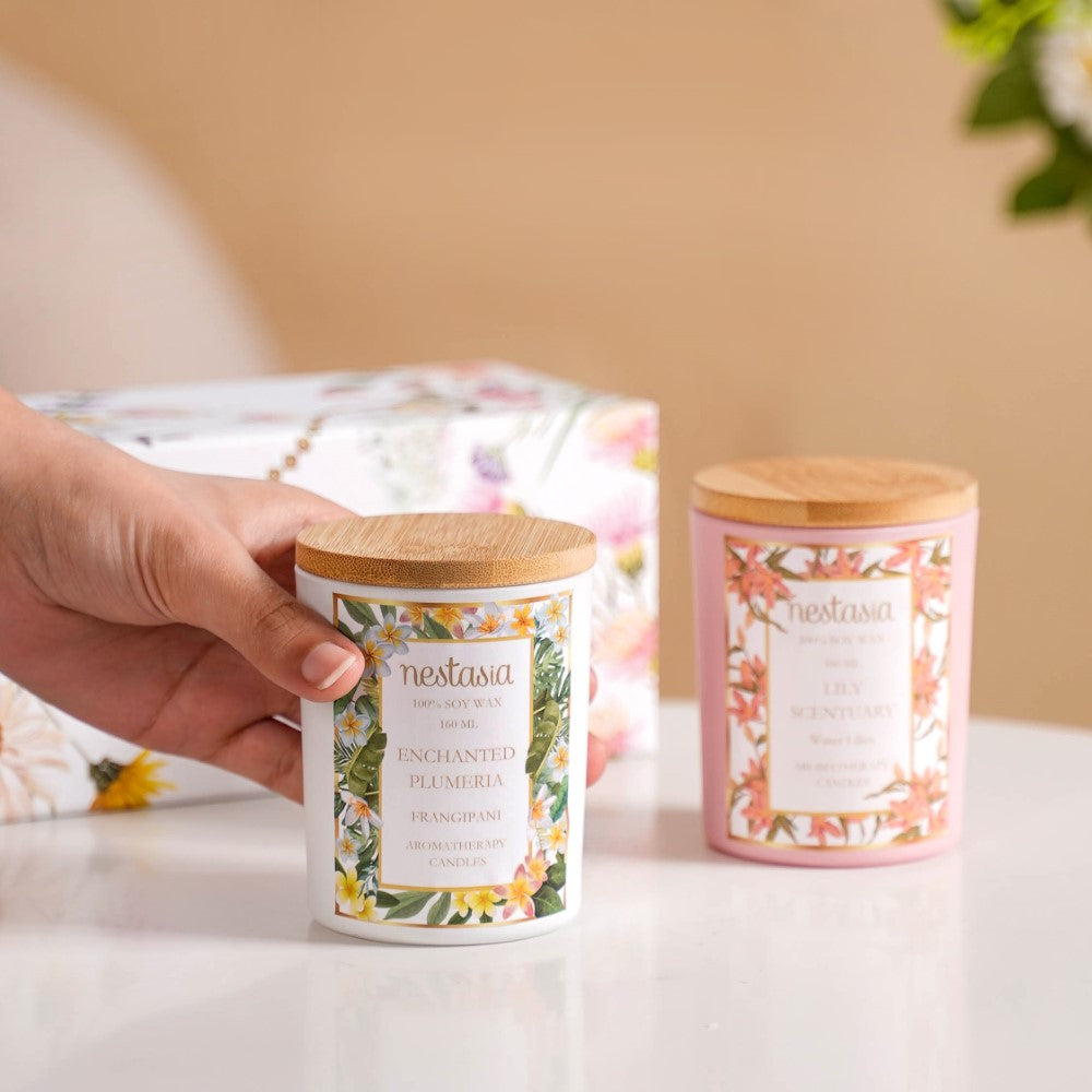 The captivating set of 2 distinctive scented candles, each offers a unique sensory journey. The Plumeria Scented Candle exudes the delicate and enchanting notes of Frangipani, filling your space with the essence of blooming flowers. The Lily Scented Candle, on the other hand, presents the refreshing aroma of Water Lilies, creating a tranquil ambience. Encased in sleek matte-finish glass jars with bamboo lids, these candles add a touch of elegance to any setting. Unwind and immerse yourself in the soothing fragrances of this exquisite candle set.